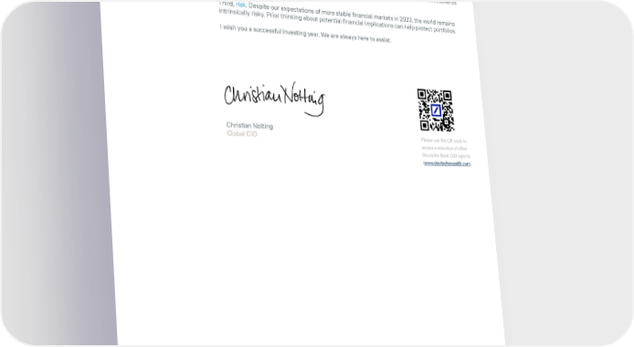 CIO Insights Resilience versus recession Portfolio management in 2023 needs to plan for this. All investors should consider the following three factors. First, easing but continued inflation. Consider possible partial hedges against this in terms of asset classes (e.g. equities) or themes and sectors (e.g. some infrastructure). Second, generally modest but positive return expectations. We forecast mid-single digit equity returns, for example. Investors seeking higher returns may want to look to alternative investments in private markets. Third, risk. Despite our expectations of more stable financial markets in 2023, the world remains intrinsically risky. Prior thinking about potential financial implications can help protect portfolios. I wish you a successful investing year. We are always here to assist. Christian Nolting Global CIO Please use the QR code to access a selection of other Deutsche Bank CIO reports (www.deutschewealth.com). In Europe, Middle East and Africa as well as in Asia Pacific this material is considered marketing material, but this is not the case in the U.S. No assurance can be given that any forecast or target can be achieved. Forecasts are based on assumptions, estimates, opinions and hypothetical models which may prove to be incorrect. Past performance is not indicative of future returns. Performance refers to a nominal value based on price gains/losses and does not take into account inflation. Inflation will have a negative impact on the purchasing power of this nominal monetary value. Depending on the current level of inflation, this may lead to a real loss in value, even if the nominal performance of the investment is positive. Investments come with risk. The value of an investment can fall as well as rise and you might not get back the amount originally invested at any point in time. Your capital may be at risk. This document was produced in December 2022. 3