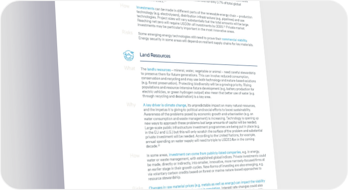 CIO Insights Resilience versus recession Why Development of new energy sources will remain a focus of government policy due to climate change and security concerns (reinforced by the Russian invasion of Ukraine). For example, the REPowerEU plan brings forward hydrogen-specific targets on energy use, transportation networks and regulation. The European Commission now targets 10 Mt of production and 10 Mt of imports of hydrogen by 2030, while also setting aside EUR200mn for research.8 In the U.S., the Inflation Reduction Act introduces a graduated system of tax credits based on lifecycle emissions, aimed at making “green” hydrogen cheaper than the “grey” alternative.9 There is a lot to do: the IEA estimates that low-emission hydrogen production accounted for only 0.7% of total global production in 2021.10 How Investments can be made in different parts of the renewable energy chain – production technology (e.g. electrolysers), distribution infrastructure (e.g. pipelines) and use technologies. Project sizes will vary substantially but the total amounts will be large. 11 Reaching net zero will require USD3tn of investments by 2050. Private market investments may be particularly important in the most innovative areas. Risks Some emerging energy technologies still need to prove their commercial viability. Energy security in some areas will depend on resilient supply chains for key materials. Land Resources What The land’s resources – mineral, water, vegetable or animal – need careful stewardship to preserve them for future generations. This can involve reduced consumption, conservation and recycling and may use both technology and nature-based solutions (e.g. forest preservation). Protecting biodiversity will be a growing priority. Rising populations and resource-intensive future development (e.g. battery production for electric vehicles, or green hydrogen output) also mean that better use of water (e.g. through recycling and desalination) is a key area. Why A key driver is climate change, its unpredictable impact on many natural resources, and the impetus it is giving to political and social efforts to boost sustainability. Awareness of the problems posed by economic growth and urbanisation (e.g. on water consumption and waste management) is increasing. Technology is opening up new ways to approach these problems but large amounts of capital will be needed. Large-scale public infrastructure investment programmes are being put in place (e.g. in the EU and U.S.) but this will only scratch the surface of the problem and substantial private investment will be needed. According to the United Nations, for example, annual spending on water supply will need to triple to USD114bn in the coming decade.12 How In some areas, investment can come from publicly-listed companies, e.g. in energy, water or waste management, with established global indices. Private investments could be made, directly or indirectly, into smaller, innovative, more narrowly-focused firms at an earlier stage in their growth cycles. New forms of investing are also emerging, e.g. via voluntary carbon credits based on forest or marine nature-based approaches to resource stewardship. Risks Changes in raw material prices (e.g. metals as well as energy) can impact the viability of resource projects, as can changes in regulation. Interest rate changes could also have an impact on investment valuations. Overall fiscal pressures could limit public funding initiatives. Political risks may also come from populist parties opposed to the environmental agenda. Improving data and understanding of life on land could shift policy priorities. In Europe, Middle East and Africa as well as in Asia Pacific this material is considered marketing material, but this is not the case in the U.S. No assurance can be given that any forecast or target can be achieved. Forecasts are based on assumptions, estimates, opinions and hypothetical models which may prove to be incorrect. Past performance is not indicative of future returns. Performance refers to a nominal value based on price gains/losses and does not take into account inflation. Inflation will have a negative impact on the purchasing power of this nominal monetary value. Depending on the current level of inflation, this may lead to a real loss in value, even if the nominal performance of the investment is positive. Investments come with risk. The value of an investment can fall as well as rise and you might not get back the amount originally invested at any point in time. Your capital may be at risk. This document was produced in December 2022. 28