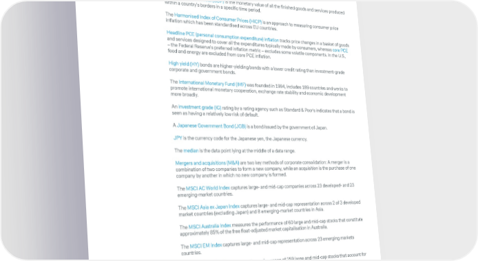 CIO Insights Resilience versus recession Glossary The FTSE MIB Index includes the 40 most trade stocks on the Italian national stock exchange. GBP is the currency code for the British pound/sterling. Gilts are bonds that are issued by the British Government. Government bonds are issued by a government to support government spending, mostly in the country's domestic currency and are backed by the full faith of the government. Gross domestic product (GDP) is the monetary value of all the finished goods and services produced within a country's borders in a specific time period. The Harmonised Index of Consumer Prices (HICP) is an approach to measuring consumer price inflation which has been standardised across EU countries. Headline PCE (personal consumption expenditure) inflation tracks price changes in a basket of goods and services designed to cover all the expenditures typically made by consumers, whereas core PCE – the Federal Reserve's preferred inflation metric – excludes some volatile components. In the U.S., food and energy are excluded from core PCE inflation. High yield (HY) bonds are higher-yielding bonds with a lower credit rating than investment-grade corporate and government bonds. The International Monetary Fund (IMF) was founded in 1994, includes 189 countries and works to promote international monetary cooperation, exchange rate stability and economic development more broadly. An investment grade (IG) rating by a rating agency such as Standard & Poor's indicates that a bond is seen as having a relatively low risk of default. A Japanese Government Bond (JGB) is a bond issued by the government of Japan. JPY is the currency code for the Japanese yen, the Japanese currency. The median is the data point lying at the middle of a data range. Mergers and acquisitions (M&A) are two key methods of corporate consolidation: A merger is a combination of two companies to form a new company, while an acquisition is the purchase of one company by another in which no new company is formed. The MSCI AC World Index captures large- and mid-cap companies across 23 developed- and 23 emerging-market countries. The MSCI Asia ex Japan Index captures large- and mid-cap representation across 2 of 3 developed market countries (excluding Japan) and 8 emerging-market countries in Asia. The MSCI Australia Index measures the performance of 60 large and mid-cap stocks that constitute approximately 85% of the free float-adjusted market capitalisation in Australia. The MSCI EM Index captures large- and mid-cap representation across 23 emerging markets countries. The MSCI Japan Index measures the performance of 259 large and mid-cap stocks that account for about 85% of Japanese market capitalisation. The NASDAQ index is a market capitalisation-weighted index of around 3,000 equities listed on the Nasdaq exchange. The National Bureau of Economic Research founded in 1920 in the U.S. conducts and disseminates non-partisan economic research. In Europe, Middle East and Africa as well as in Asia Pacific this material is considered marketing material, but this is not the case in the U.S. No assurance can be given that any forecast or target can be achieved. Forecasts are based on assumptions, estimates, opinions and hypothetical models which may prove to be incorrect. Past performance is not indicative of future returns. Performance refers to a nominal value based on price gains/losses and does not take into account inflation. Inflation will have a negative impact on the purchasing power of this nominal monetary value. Depending on the current level of inflation, this may lead to a real loss in value, even if the nominal performance of the investment is positive. Investments come with risk. The value of an investment can fall as well as rise and you might not get back the amount originally invested at any point in time. Your capital may be at risk. This document was produced in December 2022. 40