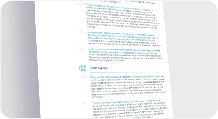 CIO Insights Resilience versus recession Millennials and Gen Z What Millennials, or Generation Y, are usually defined as those born between the early 18 1980s and the mid-1990s. They are now between their late 20s and early 40s. This is a generation who are seen as good at handling multiple sources of knowledge and dealing with both real and virtual experiences, but who are less true “digital natives” than their successors (Gen Z, born 1995–2010). These artificial “generations” can be compared to previous groups (Gen X and baby boomers) to identify differences in consumer behaviour and life priorities.19 Why The purchasing power of this group will remain large and they could also have an increasing influence on political decision making (e.g. on economic policy) as the relative number of older baby-boomer voters falls. Millennials are seen as wanting 20 services that can give them access to products without the problems of ownership. They place a high value on convenience of access to goods and services, and trust is also very important to them. Using digital media, they are concerned about comparing and finding the best deal.21 They also expect the companies they deal with to behave sustainably and socially, and this may lead them to favour companies with high ESG scorings. How Areas particularly affected by millennials’ preferences include social media and entertainment, health and fitness, clothing and clothing accessories, food and drink, travel and leisure, housing and household goods, and financial services. Smaller companies that focus specifically on millennials are rather less common in listed 22 markets. Private markets will offer a range of opportunities across these broad areas. Risks Longer-term economic development is important: millennials’ spending power could be impacted by lower salary growth, increased taxation (to meet many countries’ increasing fiscal burdens) or problems due to inter-generational wealth inequality (e.g. in housing). Worsening environmental concerns could also force millennials to reassess their own spending levels and priorities. Smart mobility What Smart mobility is defined as energy-efficient, low-emission, safe, comfortable and cost- effective mobility. It is not just about self-driving or electric cars. It has a much broader scope, including different transport methods and ownership structures (public, private and shared). It involves both new projects and the optimisation of existing offerings with regard to environmental concerns and other factors. Connectivity and real-time information provision will be key to many new and innovative approaches but the theme does not necessarily have a narrow information and communications technology (ICT) focus.23 Why There are three key drivers: sustainability, urbanisation and changing consumer demand. First, the political and social drive for more sustainability. Achieving net zero CO targets will need more than just the adoption of electrical vehicles. We will have to 2 rethink mobility as a whole. Second, smart mobility will have to address the side-effects of further urbanization (e.g., greater traffic congestion, particularly in supercities). Third, changing consumer demand patterns may increasingly favour more flexible 24 individual mobility (e.g. short-term car rentals over car ownership). How Investments are possible in companies that may benefit from energy storage technologies, autonomous vehicles, shared mobility and new transport methods. Some will be in the Information Technology sector but the Consumer Discretionary, Industrials and Materials sectors are also relevant. Investments can therefore cover the entire supply chain – from production to software.25 In Europe, Middle East and Africa as well as in Asia Pacific this material is considered marketing material, but this is not the case in the U.S. No assurance can be given that any forecast or target can be achieved. Forecasts are based on assumptions, estimates, opinions and hypothetical models which may prove to be incorrect. Past performance is not indicative of future returns. Performance refers to a nominal value based on price gains/losses and does not take into account inflation. Inflation will have a negative impact on the purchasing power of this nominal monetary value. Depending on the current level of inflation, this may lead to a real loss in value, even if the nominal performance of the investment is positive. Investments come with risk. The value of an investment can fall as well as rise and you might not get back the amount originally invested at any point in time. Your capital may be at risk. This document was produced in December 2022. 32