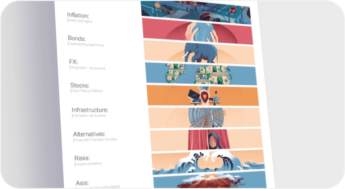 CIO Insights Resilience versus recession Contents Letter to investors p.2 Macroeconomic and asset class outlook for 2023 p.4 Growth: | stop and go Inflation: | lower and higher Bonds: | approaching equilibrium FX: | King dollar – turnaround Stocks: | from TINA to TAPAs? Infrastructure: | the best is yet to come Alternatives: | if you don't like beta, try alpha Risks: | known unknowns Asia: | hope in the Year of the Rabbit ESG: | energy transition – climate is macro essential Our long-term investment p.27 themes (LTIT) In Europe, Middle East and Africa as well as in Asia Pacific this material is considered marketing material, but this is not the case in the U.S. No assurance can be given that any forecast or target can be achieved. Forecasts are based on assumptions, estimates, opinions and hypothetical models which may prove to be incorrect. Past performance is not indicative of future returns. Performance refers to a nominal value based on price gains/losses and does not take into account inflation. Inflation will have a negative impact on the purchasing power of this nominal monetary value. Depending on the current level of inflation, this may lead to a real loss in value, even if the nominal performance of the investment is positive. Investments come with risk. The value of an investment can fall as well as rise and you might not get back the amount originally invested at any point in time. Your capital may be at risk. This document was produced in December 2022. 1