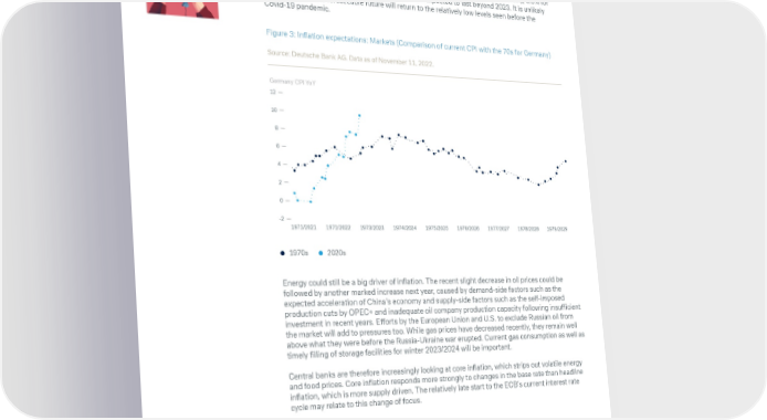 CIO Insights Resilience versus recession 02 Inflation: lower and higher Inflation has become a dominant topic again. We estimate consumer price inflation of 8.9% in Germany, 8.4% in the Eurozone and 8.2% in the U.S. for full year 2022. Inflation will still be well above the targets set by the central banks in Europe and the U.S. in 2023. While headline inflation seems to have already peaked in the U.S., it might not peak in Germany and the Eurozone until February or March 2023. For 2023 as a whole, we expect inflation of 7.0% for Germany, 6.0% for the Eurozone and 4.1% for the U.S. High inflation is expected to last beyond 2023. It is unlikely that inflation in the foreseeable future will return to the relatively low levels seen before the Covid-19 pandemic. Figure 3: Inflation expectations: Markets (Comparison of current CPI with the 70s for Germany) Source: Deutsche Bank AG. Data as of November 11, 2022. Germany CPI YoY 12 10 8 6 4 2 0 -2 1971/2021 1971/2022 1973/2023 1974/2024 1975/2025 1976/2026 1977/2027 1978/2028 1979/2029 1970s 2020s Energy could still be a big driver of inflation. The recent slight decrease in oil prices could be followed by another marked increase next year, caused by demand-side factors such as the expected acceleration of China’s economy and supply-side factors such as the self-imposed production cuts by OPEC+ and inadequate oil company production capacity following insufficient investment in recent years. Efforts by the European Union and U.S. to exclude Russian oil from the market will add to pressures too. While gas prices have decreased recently, they remain well above what they were before the Russia-Ukraine war erupted. Current gas consumption as well as timely filling of storage facilities for winter 2023/2024 will be important. Central banks are therefore increasingly looking at core inflation, which strips out volatile energy and food prices. Core inflation responds more strongly to changes in the base rate than headline inflation, which is more supply driven. The relatively late start to the ECB’s current interest rate cycle may relate to this change of focus. In Europe, Middle East and Africa as well as in Asia Pacific this material is considered marketing material, but this is not the case in the U.S. No assurance can be given that any forecast or target can be achieved. Forecasts are based on assumptions, estimates, opinions and hypothetical models which may prove to be incorrect. Past performance is not indicative of future returns. Performance refers to a nominal value based on price gains/losses and does not take into account inflation. Inflation will have a negative impact on the purchasing power of this nominal monetary value. Depending on the current level of inflation, this may lead to a real loss in value, even if the nominal performance of the investment is positive. Investments come with risk. The value of an investment can fall as well as rise and you might not get back the amount originally invested at any point in time. Your capital may be at risk. This document was produced in December 2022. 7