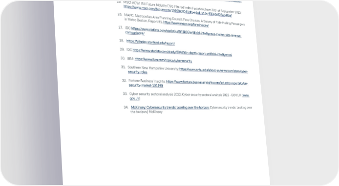 CIO Insights Resilience versus recession 22. MSCI: MSCI ACWI IMI Millennials ESG Filtered Index Factsheet from 30th of September 2022. https://www.msci.com/documents/10199/7b720494-bb6e-6b30-de3e-e931f0dd79ea 23. Stefan Wolter: Smart Mobility- Intelligente Vernetzung der Verkehrsangebote in Großstädten, found on: https://link.springer.com/chapter/10.1007/978-3-8349-7117-3_42 24. Springer Professional: Dies sind die fünf Shared-Mobility-Trends 2021: https://www. springerprofessional.de/mobilitaetskonzepte/corona-krise/die-sind-die-fuenf-shared-mobility- trends-2021/18757082 25. MSCI ACWI IMI Future Mobility ESG Filtered Index Factsheet from 30th of September 2022: https://www.msci.com/documents/10199/c0041df5-e1a1-113c-ff39-0a923a34fdaf 26. MAPC. Metropolian Area Planning Council: Fare Choices. A Survey of Ride-Hailing Passengers in Metro Boston. Report #1. https://www.mapc.org/farechoices/ 27. IDC https://www.statista.com/statistics/941835/artificial-intelligence-market-size-revenue- comparisons/ 28. https://aiindex.stanford.edu/report/ 29. IDC https://www.statista.com/study/50485/in-depth-report-artificial-intelligence/ 30. IBM: https://www.ibm.com/topics/cybersecurity 31. Southern New Hampshire University: https://www.snhu.edu/about-us/newsroom/stem/cyber- security-roles 32. Fortune Business Insights: https://www.fortunebusinessinsights.com/industry-reports/cyber- security-market-101165 33. Cyber security sectoral analysis 2022: Cyber security sectoral analysis 2022 - GOV.UK (www. gov.uk) 34. McKinsey: Cybersecurity trends: Looking over the horizon: Cybersecurity trends: Looking over the horizon | McKinsey In Europe, Middle East and Africa as well as in Asia Pacific this material is considered marketing material, but this is not the case in the U.S. No assurance can be given that any forecast or target can be achieved. Forecasts are based on assumptions, estimates, opinions and hypothetical models which may prove to be incorrect. Past performance is not indicative of future returns. Performance refers to a nominal value based on price gains/losses and does not take into account inflation. Inflation will have a negative impact on the purchasing power of this nominal monetary value. Depending on the current level of inflation, this may lead to a real loss in value, even if the nominal performance of the investment is positive. Investments come with risk. The value of an investment can fall as well as rise and you might not get back the amount originally invested at any point in time. Your capital may be at risk. This document was produced in December 2022. 36