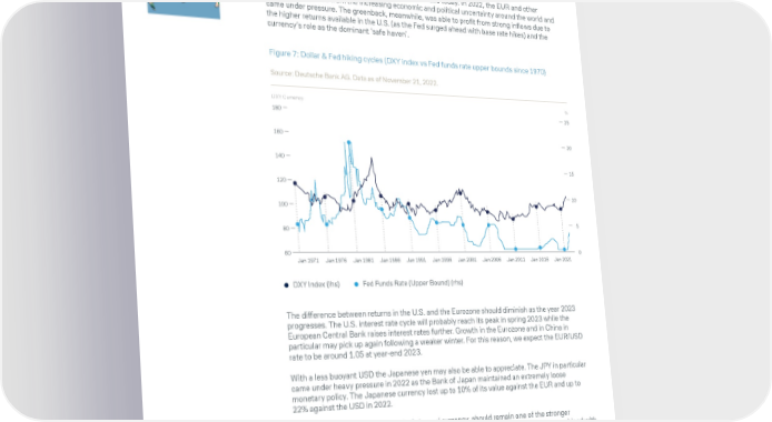 CIO Insights Resilience versus recession 04 FX: King dollar – turnaround More than 50 years ago, then-U.S. Treasury Secretary John Connally said, ‘The dollar is our currency, but it is your problem’. President Nixon had suspended the country’s commitment to the convertibility of the USD into gold, putting an end to the Bretton Woods system of fixed exchange rates. Connally’s provocative observation remains just as valid today. In 2022, the EUR and other currencies suffered from the increasing economic and political uncertainty around the world and came under pressure. The greenback, meanwhile, was able to profit from strong inflows due to the higher returns available in the U.S. (as the Fed surged ahead with base rate hikes) and the currency’s role as the dominant ‘safe haven’. Figure 7: Dollar & Fed hiking cycles (DXY index vs Fed funds rate upper bounds since 1970) Source: Deutsche Bank AG. Data as of November 21, 2022. DXY Currency % 180 25 160 20 140 15 120 10 100 80 5 60 0 Jan 1971 Jan 1976 Jan 1981 Jan 1986 Jan 1991 Jan 1996 Jan 2001 Jan 2006 Jan 2011 Jan 2016 Jan 2021 DXY Index (Ihs) Fed Funds Rate (Upper Bound) (rhs) The difference between returns in the U.S. and the Eurozone should diminish as the year 2023 progresses. The U.S. interest rate cycle will probably reach its peak in spring 2023 while the European Central Bank raises interest rates further. Growth in the Eurozone and in China in particular may pick up again following a weaker winter. For this reason, we expect the EUR/USD rate to be around 1.05 at year-end 2023. With a less buoyant USD the Japanese yen may also be able to appreciate. The JPY in particular came under heavy pressure in 2022 as the Bank of Japan maintained an extremely loose monetary policy. The Japanese currency lost up to 10% of its value against the EUR and up to 22% against the USD in 2022. The CHF which is also seen as a ‘safe haven’ currency, should remain one of the stronger currencies in 2023, especially as Switzerland can now also offer positive base rates combined with relatively low inflation of 3%. By contrast, the pound sterling could continue its downward path in 2023, as the post-Brexit United Kingdom faces up to a range of economic difficulties. In Europe, Middle East and Africa as well as in Asia Pacific this material is considered marketing material, but this is not the case in the U.S. No assurance can be given that any forecast or target can be achieved. Forecasts are based on assumptions, estimates, opinions and hypothetical models which may prove to be incorrect. Past performance is not indicative of future returns. Performance refers to a nominal value based on price gains/losses and does not take into account inflation. Inflation will have a negative impact on the purchasing power of this nominal monetary value. Depending on the current level of inflation, this may lead to a real loss in value, even if the nominal performance of the investment is positive. Investments come with risk. The value of an investment can fall as well as rise and you might not get back the amount originally invested at any point in time. Your capital may be at risk. This document was produced in December 2022. 12