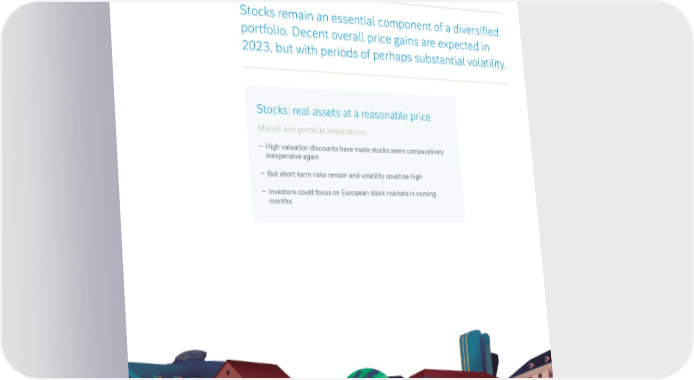 CIO Insights Resilience versus recession However, given the country’s continued strong economic momentum, it is difficult to see the Indian stock market as fundamentally overpriced. Japan should benefit from its delayed and still-ongoing Covid-19 recovery as well as accommodative fiscal and monetary policy. Similar in some ways to Germany, the country’s cyclical structure is highly dependent on China, which could provide a tailwind in 2023 and make Japanese equities a useful tool for diversification. Stocks remain an essential component of a diversified portfolio. Decent overall price gains are expected in 2023, but with periods of perhaps substantial volatility. Stocks: real assets at a reasonable price Market and portfolio implications: o High valuation discounts have made stocks seem comparatively inexpensive again o But short-term risks remain and volatility could be high o Investors could focus on European stock markets in coming months In Europe, Middle East and Africa as well as in Asia Pacific this material is considered marketing material, but this is not the case in the U.S. No assurance can be given that any forecast or target can be achieved. Forecasts are based on assumptions, estimates, opinions and hypothetical models which may prove to be incorrect. Past performance is not indicative of future returns. Performance refers to a nominal value based on price gains/losses and does not take into account inflation. Inflation will have a negative impact on the purchasing power of this nominal monetary value. Depending on the current level of inflation, this may lead to a real loss in value, even if the nominal performance of the investment is positive. Investments come with risk. The value of an investment can fall as well as rise and you might not get back the amount originally invested at any point in time. Your capital may be at risk. This document was produced in December 2022. 16