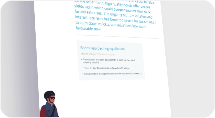 CIO Insights Resilience versus recession Active bond portfolio management remains the watchword in 2023, coupled with the dynamic management of maturities and default probabilities (i.e. ratings). Floaters – bonds with variable returns – might be useful here. Investors who are willing to take risks might also be interested in exploiting possible exchange rate differences. 2023 will give bond market investors no cause to relax. On the other hand, high quality bonds offer decent yields again which could compensate for the risk of further rate rises. The ongoing hit from inflation and interest rate rises has been too severe for the situation to calm down quickly, but valuations look more favourable now. Bonds: approaching equilibrium Market and portfolio implications: o The situation may calm down slightly in 2023 but the risk of volatility remains o Focus on liquid investments and good credit ratings o Active portfolio management remains the watchword for investors In Europe, Middle East and Africa as well as in Asia Pacific this material is considered marketing material, but this is not the case in the U.S. No assurance can be given that any forecast or target can be achieved. Forecasts are based on assumptions, estimates, opinions and hypothetical models which may prove to be incorrect. Past performance is not indicative of future returns. Performance refers to a nominal value based on price gains/losses and does not take into account inflation. Inflation will have a negative impact on the purchasing power of this nominal monetary value. Depending on the current level of inflation, this may lead to a real loss in value, even if the nominal performance of the investment is positive. Investments come with risk. The value of an investment can fall as well as rise and you might not get back the amount originally invested at any point in time. Your capital may be at risk. This document was produced in December 2022. 11