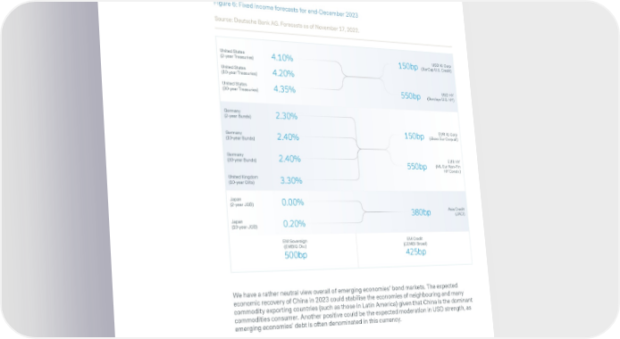 CIO Insights Resilience versus recession Yields and quality are now no longer mutually exclusive. European bank bonds, for example, would seem to be worth greater consideration because underlying capital adequacy and credit risk data have improved substantially in recent years. Following what is expected to be a still slightly bumpy winter economically, the focus in the course of 2023 could turn to riskier and higher-yielding corporate bonds. In the case of government bonds, anticipated interest rate developments mean that U.S. paper should initially prove more interesting than German equivalents. Figure 6: Fixed income forecasts for end-December 2023 Source: Deutsche Bank AG. Forecasts as of November 17, 2022. United States 4.10% 150bp USD IG Corp (2-year Treasuries) (BarCap U.S. Credit) United States 4.20% (10-year Treasuries) United States 4.35% 550bp USD HY (30-year Treasuries) (Barclays U.S. HY) Germany 2.30% (2-year Bunds) 150bp EUR IG Corp Germany 2.40% (iBoxx Eur Corp all) (10-year Bunds) Germany 2.40% EUR HY (30-year Bunds) 550bp (ML Eur Non-Fin HY Constr.) United Kingdom 3.30% (10-year Gilts) Japan 0.00% (2-year JGB) 380bp Asia Credit (JACI) Japan 0.20% (10-year JGB) EM Sovereign EM Credit (EMBIG Div.) (CEMBI Broad) 500bp 425bp We have a rather neutral view overall of emerging economies’ bond markets. The expected economic recovery of China in 2023 could stabilise the economies of neighbouring and many commodity exporting countries (such as those in Latin America) given that China is the dominant commodities consumer. Another positive could be the expected moderation in USD strength, as emerging economies’ debt is often denominated in this currency. In Europe, Middle East and Africa as well as in Asia Pacific this material is considered marketing material, but this is not the case in the U.S. No assurance can be given that any forecast or target can be achieved. Forecasts are based on assumptions, estimates, opinions and hypothetical models which may prove to be incorrect. Past performance is not indicative of future returns. Performance refers to a nominal value based on price gains/losses and does not take into account inflation. Inflation will have a negative impact on the purchasing power of this nominal monetary value. Depending on the current level of inflation, this may lead to a real loss in value, even if the nominal performance of the investment is positive. Investments come with risk. The value of an investment can fall as well as rise and you might not get back the amount originally invested at any point in time. Your capital may be at risk. This document was produced in December 2022. 10