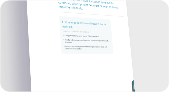 CIO Insights Resilience versus recession The debate about the energy transition and energy resilience has gained momentum recently in the light of the Russia-Ukraine war. We face a global challenge that requires consideration of the ideas and goals of developing and emerging economies especially, and also of the resulting social and regulatory issues.7 The success of the global energy transition will depend largely on its fair implementation, addressing the social and governance issues. Global energy transition success is essential to continued development but must be seen as being implemented fairly. ESG: energy transition – climate is macro essential Market and portfolio implications: o Energy transition is a key part of ESG investments o It will create massive new long-term investment opportunities for investors o But success will depend on addressing associated social and governance issues too. In Europe, Middle East and Africa as well as in Asia Pacific this material is considered marketing material, but this is not the case in the U.S. No assurance can be given that any forecast or target can be achieved. Forecasts are based on assumptions, estimates, opinions and hypothetical models which may prove to be incorrect. Past performance is not indicative of future returns. Performance refers to a nominal value based on price gains/losses and does not take into account inflation. Inflation will have a negative impact on the purchasing power of this nominal monetary value. Depending on the current level of inflation, this may lead to a real loss in value, even if the nominal performance of the investment is positive. Investments come with risk. The value of an investment can fall as well as rise and you might not get back the amount originally invested at any point in time. Your capital may be at risk. This document was produced in December 2022. 26