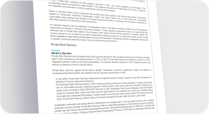 Deutsche Bank Transition toward a sustainable and climate-neutral economy Non-Financial Report 2022 Sustainable finance Private Bank Private Bank wants to be a trustworthy partner for its clients on their path to sustainability and wants to contribute to an environmentally sound, socially inclusive and well governed economy and society. Private Bank provides its clients with differentiated ESG advisory and solutions, in Germany with two complementary brands – Deutsche Bank and Postbank – for private clients as well as internationally with focus on wealthy individuals, entrepreneurs and family associations, as well as small and medium enterprises in selected European countries. In 2022, Private Bank continued its ESG program, launched in 2021, and further propelled its transformation. The corresponding teams coordinate the implementation of the objectives derived from Private Bank‘s ESG vision, in particular the integration and coordination of advisory approaches, products and processes. Based on Deutsche Bank Group’s framework that evolved along with regulatory and market requirements, Private Bank applied its “Sustainable Investment Classification Criteria” and further refined them in 2022 taking into consideration sustainability criteria defined under Markets in Financial Instruments Directive II. Compliance with the criteria is checked on a daily basis as part of an automated product governance. An important milestone was the integration of sustainability criteria in the advisory process compliant also to the regulatory requirements of Markets in Financial Instruments Directive II. These regulatory requirements apply to all legal entities and business units of Private Bank based in the European Union and/or provide financial services to European clients. This involves asking for and considering the client’s sustainability preferences based on a defined and reliable process. Private Bank’s respective target market concept takes into account the process of discretionary portfolio management services and its equities, exchange-traded and mutuals funds, bonds and structured products. Private Bank Germany Overview GRI 201-2, FS4, FS14 Private Bank Germany aims to meet private client’s growing demand for ESG compliant products and services by providing best-in-class transparency and leading advisory on ESG. In 2022, Private Bank Germany proceeded on its path to an ESG integrated business model by anchoring sustainability in its business activities ranging from ESG compliant products and advisory processes to remote customer advice. Private Bank Germany applied Private Bank’s updated “Sustainable Investment Classification Criteria” and aligned its processes and product portfolio with regards to the key regulatory developments in 2022: – In July 2022, Private Bank Germany implemented an adjusted advisory process compliant to the ESG requirements of Markets in Financial Instruments Directive II – On the Private Bank Germany platform, ESG investment product portfolio was further extended; it included mutual funds with an ESG-related thematic investment approach (Pictet Nutrition, DWS Invest ESG Next Generation Infrastructure), equity funds converted to ESG (DWS ESG Akkumula or BSF Sustainable Fixed Income Strategies) and Green Bonds issued by Deutsche Bank; funds must meet minimum requirements to be considered as an ESG fund, including whether the funds have a dedicated ESG strategy, consider specific exclusions and meet a minimum MSCI ESG rating; at year end 2022, Private Bank Germany offered a total of 32 actively managed ESG funds, eight more than a year earlier Sustainable construction and energy-efficient modernization are strategic topics in the real estate business, both in existing properties and new buildings. Private Bank Germany offers a sustainability package providing financing solutions including a climate loan with interest rate reduction and supporting services. Through BHW Bausparkasse AG (BHW AG), a directly held Deutsche Bank subsidiary. Following Deutsche Bank’s Sustainability Framework, BHW defines sustainability standards with additional specifications for its products and services. The introduction of ESG advisory concept, which began in 2021, was continued in 2022 and was completed in all 400 Deutsche Bank branches and seven regional advisory centers. For the Postbank brand, an initial pilot was carried out at six locations, which is aimed to be developed further in the first quarter of 2023. The ESG advisory concept comprises a broad qualification program for employees and makes sustainability tangible for clients in the branches through visible design elements. Deutsche Bank eSafe is a digital safe connected to the client’s bank account. In addition to digital bank and deposit statements, documents such as copies of identity cards, contracts or passwords can be stored here. 30
