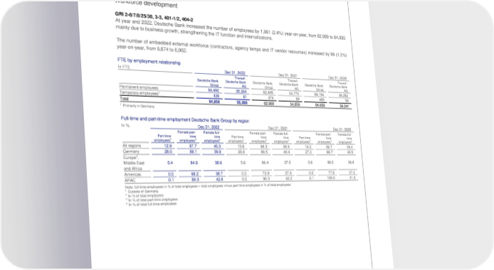Deutsche Bank Employees and corporate social responsibility Non-Financial Report 2022 Employment and employability The bank’s monthly HR Controls Dashboard monitors HR’s operating performance in managing employment practices risk and provides an overview of important control indicators regarding the employee life cycle. The results are presented to the bank’s HR Executive Committee, which determines whether the matter needs to be reported to the Management Board. Since its implementation in 2019, the dashboard has reinforced risk awareness among the bank’s HR leaders and has thus helped strengthen HR’s control environment. Workforce management Workforce development GRI 2-6/7/8/25/30, 3-3, 401-1/2, 404-2 At year end 2022, Deutsche Bank increased the number of employees by 1,961 (2.4%) year-on-year, from 82,969 to 84,930 mainly due to business growth, strengthening the IT function and internalizations. The number of embedded external workforce (contractors, agency temps and IT vendor resources) increased by 88 (1.3%) year-on-year, from 6,874 to 6,962. FTE by employment relationship In FTE Dec 31, 2022 Dec 31, 2021 Dec 31, 2020 Thereof: Thereof: Thereof: Deutsche Bank Deutsche Bank Deutsche Bank Deutsche Bank Deutsche Bank Deutsche Bank Group AG Group AG Group AG Permanent employees 84,492 35,204 82,495 34,770 84,194 36,282 Temporary employees1 438 81 474 89 465 59 Total 84,930 35,285 82,969 34,859 84,659 36,341 1 Primarily in Germany Full-time and part-time employment Deutsche Bank Group by region In % Dec 31, 2022 Dec 31, 2021 Dec 31, 2020 Female part- Female full- Female part- Female full- Female part- Female full- Part-time time time Part-time time time Part-time time time 2 3 4 2 3 4 2 3 4 employees employees employees employees employees employees employees employees employees All regions 12.9 87.7 40.3 13.8 88.3 39.9 14.3 88.7 39.4 Germany 26.0 88.1 39.8 26.8 88.5 40.4 27.2 88.7 40.5 1 Europe , Middle East 5.4 84.6 38.6 5.6 86.4 37.5 5.8 88.5 36.8 and Africa Americas 0.3 68.2 38.7 0.3 73.9 37.8 0.2 77.8 37.2 APAC 0.1 89.3 42.8 0.2 90.3 42.2 0.1 100.0 41.0 Note: full-time employees in % of total employees = total employees minus part-time employees in % of total employees 1 Outside of Germany 2 In % of total employees 3 In % of total part-time employees 4 In % of total full-time employees 110