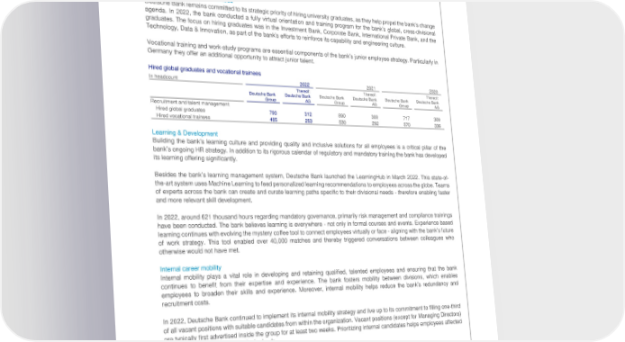 Deutsche Bank Employees and corporate social responsibility Non-Financial Report 2022 Employment and employability Average time to fill vacant positions 1,2 In days 2022 2021 2020 Thereof: Thereof: Thereof: Deutsche Bank Deutsche Bank Deutsche Bank Deutsche Bank Deutsche Bank Deutsche Bank Group AG Group AG Group AG Average length to fill vacant positions 86 81 81 74 74 69 1 Days elapsed between the creation of a job opening and the date a job offer was made 2 Excluding Postbank Graduates and vocational trainees Deutsche Bank remains committed to its strategic priority of hiring university graduates, as they help propel the bank’s change agenda. In 2022, the bank conducted a fully virtual orientation and training program for the bank’s global, cross-divisional graduates. The focus on hiring graduates was in the Investment Bank, Corporate Bank, International Private Bank, and the Technology, Data & Innovation, as part of the bank’s efforts to reinforce its capability and engineering culture. Vocational training and work-study programs are essential components of the bank’s junior employee strategy. Particularly in Germany they offer an additional opportunity to attract junior talent. Hired global graduates and vocational trainees In headcount 2022 2021 2020 Thereof: Thereof: Thereof: Deutsche Bank Deutsche Bank Deutsche Bank Deutsche Bank Deutsche Bank Deutsche Bank Group AG Group AG Group AG Recruitment and talent management Hired global graduates 793 312 890 300 717 309 Hired vocational trainees 485 253 530 292 570 336 Learning & Development Building the bank’s learning culture and providing quality and inclusive solutions for all employees is a critical pillar of the bank’s ongoing HR strategy. In addition to its rigorous calendar of regulatory and mandatory training the bank has developed its learning offering significantly. Besides the bank’s learning management system, Deutsche Bank launched the LearningHub in March 2022. This state-of- the-art system uses Machine Learning to feed personalized learning recommendations to employees across the globe. Teams of experts across the bank can create and curate learning paths specific to their divisional needs - therefore enabling faster and more relevant skill development. In 2022, around 621 thousand hours regarding mandatory governance, primarily risk management and compliance trainings have been conducted. The bank believes learning is everywhere - not only in formal courses and events. Experience based learning continues with evolving the mystery coffee tool to connect employees virtually or face - aligning with the bank’s future of work strategy. This tool enabled over 40,000 matches and thereby triggered conversations between colleagues who otherwise would not have met. Internal career mobility Internal mobility plays a vital role in developing and retaining qualified, talented employees and ensuring that the bank continues to benefit from their expertise and experience. The bank fosters mobility between divisions, which enables employees to broaden their skills and experience. Moreover, internal mobility helps reduce the bank’s redundancy and recruitment costs. In 2022, Deutsche Bank continued to implement its internal mobility strategy and live up to its commitment to filling one-third of all vacant positions with suitable candidates from within the organization. Vacant positions (except for Managing Directors) are typically first advertised inside the group for at least two weeks. Prioritizing internal candidates helps employees affected by restructuring find new roles in the bank. Internal fill rates and saving from redeployment 2022 2021 2020 Thereof: Thereof: Thereof: Deutsche Bank Deutsche Bank Deutsche Bank Deutsche Bank Deutsche Bank Deutsche Bank Group AG Group AG Group AG 1 Internal job vacancy fill rate (in %) 27.3 46.1 31.0 50.2 35.9 47.4 thereof Managing Directors and Directors 42.7 53.1 38.7 46.6 52.7 53.1 thereof Vice Presidents 47.3 55.7 43.3 52.6 52.0 48.4 thereof Critical business positions2 71.0 72.0 57.1 53.3 96.4 96.0 1,3 Savings from redeployment (in € m) 12 10 32 28 24 20 1 Excluding Postbank 2 Definition in line with ISO 30414 – Human Capital Reporting 3 Sum of avoided severance/restructuring costs and saved hiring costs 113