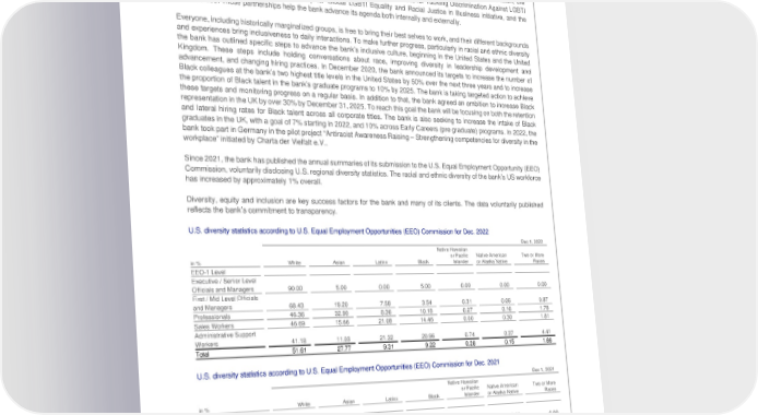 Deutsche Bank Employees and corporate social responsibility Non-Financial Report 2022 Employment and employability An inclusive work environment GRI 2-25, 3-3, 405-1, 406-1 The bank has affirmed for almost two decades that having a diverse, equitable and inclusive work environment is important to its overall success. During this time, it has forged strategic partnerships with organizations worldwide, such as Charta der Vielfalt (Charter of Diversity), the U.K. Treasury’s Women in Finance Charter, CEO Action for Diversity & Inclusion, the Diversity & Inclusion in Asia Network, the UN Standards of Conduct for Business for Tackling Discrimination Against LGBTI People, Open for Business, the Partnership for Global LGBTI Equality and Racial Justice in Business initiative, and the Valuable 500. These partnerships help the bank advance its agenda both internally and externally. Everyone, including historically marginalized groups, is free to bring their best selves to work, and their different backgrounds and experiences bring inclusiveness to daily interactions. To make further progress, particularly in racial and ethnic diversity the bank has outlined specific steps to advance the bank’s inclusive culture, beginning in the United States and the United Kingdom. These steps include holding conversations about race, improving diversity in leadership development and advancement, and changing hiring practices. In December 2020, the bank announced its targets to increase the number of Black colleagues at the bank’s two highest title levels in the United States by 50% over the next three years and to increase the proportion of Black talent in the bank’s graduate programs to 10% by 2025. The bank is taking targeted action to achieve these targets and monitoring progress on a regular basis. In addition to that, the bank agreed an ambition to increase Black representation in the UK by over 30% by December 31, 2025. To reach this goal the bank will be focusing on both the retention and lateral hiring rates for Black talent across all corporate titles. The bank is also seeking to increase the intake of Black graduates in the UK, with a goal of 7% starting in 2022, and 10% across Early Careers (pre graduate) programs. In 2022, the bank took part in Germany in the pilot project “Antiracist Awareness Raising – Strengthening competencies for diversity in the workplace” initiated by Charta der Vielfalt e.V.. Since 2021, the bank has published the annual summaries of its submission to the U.S. Equal Employment Opportunity (EEO) Commission, voluntarily disclosing U.S. regional diversity statistics. The racial and ethnic diversity of the bank’s US workforce has increased by approximately 1% overall. Diversity, equity and inclusion are key success factors for the bank and many of its clients. The data voluntarily published reflects the bank’s commitment to transparency. U.S. diversity statistics according to U.S. Equal Employment Opportunities (EEO) Commission for Dec. 2022 Dec 1, 2022 Native Hawaiian or Pacific Native American Two or More in % White Asian Latinx Black Islander or Alaska Native Races EEO-1 Level Executive / Senior Level Officials and Managers 90.00 5.00 0.00 5.00 0.00 0.00 0.00 First / Mid Level Officials and Managers 68.43 19.20 7.58 3.54 0.31 0.06 0.87 Professionals 46.36 32.90 8.36 10.18 0.27 0.16 1.78 Sales Workers 46.69 15.66 21.08 14.46 0.00 0.30 1.81 Administrative Support Workers 41.18 11.03 21.32 20.96 0.74 0.37 4.41 Total 51.61 27.77 9.31 9.22 0.28 0.15 1.66 U.S. diversity statistics according to U.S. Equal Employment Opportunities (EEO) Commission for Dec. 2021 Dec 1, 2021 Native Hawaiian or Pacific Native American Two or More in % White Asian Latinx Black Islander or Alaska Native Races EEO-1 Level Executive / Senior Level Officials and Managers 90.48 4.76 0.00 4.76 0.00 0.00 0.00 First / Mid Level Officials and Managers 69.59 17.78 7.89 3.74 0.12 0.12 0.76 Professionals 46.23 35.19 7.97 9.15 0.18 0.14 1.14 Sales Workers 47.56 16.16 17.68 17.38 0.00 0.30 0.91 Administrative Support Workers 48.08 8.89 18.51 20.91 0.00 0.24 3.37 Total 52.35 28.27 9.03 8.90 0.15 0.15 1.16 118