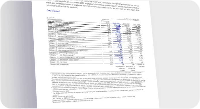 Deutsche Bank Transition toward a sustainable and climate-neutral economy Non-Financial Report 2022 In-house ecology Greenhouse gas emissions GRI 2-4, 305-1/2/3/5 An environmentally extended economic input output (EEIO) model has been used to estimate the emissions in Scope 3 categories 1, 2 and 4 based on the amount spent in each economic sector, and these cover 79% of emissions reported in the table below. Emissions in the bank’s value chain (all Scope 3 excluding investments) amounted to around 1.725 million metric tons of CO e 2 in 2022, a decrease of 4.2% compared to 2021, largely due to the reduced spend on use of IT services. Employee commuting, which also includes emissions of employees working from home, decreased over the last year, which is a direct impact of the return to the office after the pandemic. GHG emissions1 Twelve months ended as of Variance from in t of CO e previous period 2 (unless stated differently) (in %) Sep 30, 2022¹ Dec 31, 2021² Dec 31, 2020² 3,4 Total GHG emissions (market-based) (4.2) 1,725,229 1,800,391 1,843,369 Scope 1, direct GHG emissions (19.3) 25,110 31,122 39,875 Scope 2, indirect GHG emissions (15.4) 30,751 36,331 78,846 4 Scope 3, other indirect GHG emissions (3.7) 1,669,367 1,732,938 1,724,649 Category 1 - purchased goods and services (6.3) 1,273,274 1,358,367 1,367,139 Category 2 - capital goods 123.4 46,303 20,730 8,180 Category 3 - upstream fuel and energy related activities (8.3) 57,140 62,317 51,605 Category 4 - upstream transportation and distribution 29.0 43,585 33,792 37,024 Category 5 - waste generated in operations 112.5 644 303 385 Category 6 - business travel 238.7 18,438 5,444 14,206 5 Category 7 - employee commuting/working from home (13.8) 117,912 136,736 122,026 Category 8 - upstream leased assets N/A N/A N/A 6 Category 9 - downstream transportation and distribution (3.6) 22,569 23,409 27,268 Category 10 - processing of sold products N/A N/A N/A 7, 8 Category 11 - use of sold products N/M not disclosed 1,183 1,375 Category 12 - end-of-life treatment of sold products8 (1.1) 77,059 77,948 78,870 9 Category 13 - downstream leased assets (2.1) 12,443 12,710 16,571 Category 14 - franchises N/M N/A N/A N/A Category 15 - investments N/M See See Relevant, not explanations in explanations in disclosed Climate risk Climate risk chapter chapter 1 Data reported for 2022 is from the period October 1, 2021, to September 30, 2022. The previous year is always adjusted to January to December. Average uncertainty is +/- 10% for all KPIs. Some KPIs have changed more than +/- 10% in 2021 due to the extraordinary nature of the effect of the pandemic on the operations of the bank’s business and buildings in previous years. 2 There are several reasons for changes to prior-year figures: updated power grid factors, updates to historical data (such as billing updates), and methodology changes 3 Total emissions are based on actual, estimated, or extrapolated data, including all market-based Scope 1 and 2 emissions and relevant categories 1 to 14 of Scope 3 emissions. All assumptions and calculation methodologies are in line with the ISO 14064 Standard Guidelines with supporting documentation. The emission factors have been used for each activity data type, from internationally recognized sources, such as DEFRA/BEIS (2022), GHG Protocol, eGRID (2022), and IEA (2022), RE-DISS (2020), or, if more relevant, from country or contract specific sources. The factors include all GHGs and the gases’ Global Warming Potential pursuant to IPCC AR5 assessments. 4 The Greenhouse Gas Protocol Corporate Accounting and Reporting Standard was used to calculate Scope 1, 2 and 3 emissions. Categories 1, 2 and 4 where CEDA emission factors are used include adjustments for changes in inflation. All reported years now use CEDA Global emission factors for Germany instead of United States used in previous reporting years. 5 The GHG emission data disclosed for employee commuting/working from home decreased over the last 2 years, which is a direct impact returning to the office after the pandemic 6 Ad-hoc branch visits not included 7 Not disclosed for 2022 as immaterial 8 Categories 11 and 12 rely on calculating emissions from the number of customers, and these data are based on customer numbers in Germany only 9 Downstream leased assets of Postbank are not included in this data 65