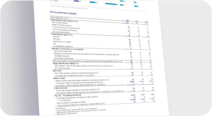 Deutsche Bank Employees and corporate social responsibility Non-Financial Report 2022 Corporate social responsibility CSR key performance indicators 2022 2021 2020 Total investments, in € m. 55.1 52.1 51.7 Investments per area of activity (in %) Born to Be/Education 24 18 17 Made for Good/Enterprise 5 5 4 1 In the Community (incl. How We Live ) 30 33 36 Plus You/Corporate Volunteering 8 8 9 Art, Culture and Sports 33 36 34 Investments per region (in %) Germany 48 52 53 Americas 20 18 19 Asia/Pacific (incl. Japan) 20 16 15 UK 10 12 10 Europe/Middle East/Africa 2 2 3 2 Motivation of contribution (in % of projects) Community investments 49 51 46 Mandatory contributions (Community Reinvestment Act investments US, Companies Act India) 31 31 31 Charitable donations 16 16 21 Commercial sponsorships 4 2 2 3 External perception of Deutsche Bank as a responsible corporate citizen (global B2B market) / (in %) 52 64 67 People reached with initiatives in m. 3.3 3.2 3.7 1 CSR programs: Born to Be, Made for Good, In the Community (incl. How We Live ) 1.4 1.8 2.4 Art, Culture & Sports 1.9 1.4 1.3 Born to Be Born to Be projects supported by corporate volunteers (in %) 49 59 57 Cumulative Born to Be beneficiaries in m. (since 2014) 5.7 5.3 4.9 Made for Good Made for Good enterprise projects supported by corporate volunteers (in %) 34 26 33 Cumulative number of participating social enterprises (since 2016) 26,908 25,534 23,078 Cumulative number of Made for Good beneficiaries in m. (since 2016) 1.6 1.4 1.2 In the Community Community projects supported by corporate volunteers (in %) 33 37 36 1 Cumulative number of beneficiaries of community projects in m. (since 2015, incl. How We Live ) 5.4 4.9 4.2 4 Plus You - Volunteering and Giving Employees participating in the bank's volunteer programs 18,707 15,487 12,885 in % of total staff 22 18 17 Hours invested by corporate volunteers 187,232 133,535 157,863 Total employee donations and matching by Deutsche Bank, in € m. 8.4 7.4 8.8 1 For 2022 only 2 Source: Global Impact Tracking 2022 (68 % of total investments) 3 Representative global B2B survey in 14 countries; top-2-values on 5-point scale 4 2020 data excl. Postbank brand 122