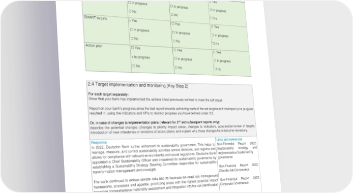 Deutsche Bank Appendix Non-Financial Report 2022 Principles for Responsible Banking Alignment x Yes ☐ Yes ☐ Yes ☐ In progress ☐ In progress ☐ In progress ☐ No ☐ No ☐ No Baseline x Yes ☐ Yes ☐ Yes ☐ In progress ☐ In progress ☐ In progress ☐ No ☐ No ☐ No SMART targets x Yes ☐ Yes ☐ Yes ☐ In progress ☐ In progress ☐ In progress ☐ No ☐ No ☐ No Action plan ☐ Yes ☐ Yes ☐ Yes x In progress ☐ In progress ☐ In progress ☐ No ☐ No ☐ No 2.4 Target implementation and monitoring (Key Step 2) For each target separately: Show that your bank has implemented the actions it had previously defined to meet the set target. Report on your bank’s progress since the last report towards achieving each of the set targets and the impact your progress resulted in, using the indicators and KPIs to monitor progress you have defined under 2.2. nd Or, in case of changes to implementation plans (relevant for 2 and subsequent reports only): describe the potential changes (changes to priority impact areas, changes to indicators, acceleration/review of targets, introduction of new milestones or revisions of action plans) and explain why those changes have become necessary. Response Links and references In 2022, Deutsche Bank further enhanced its sustainability governance. This helps to Non-Financial Report 2022: manage, measure, and control sustainability activities across divisions, and regions and Sustainability strategy and allows for compliance with relevant environmental and social regulations. Deutsche Bank implementation/Sustainability appointed a Chief Sustainability Officer and broadened its sustainability governance by governance establishing a Sustainability Strategy Steering Committee responsible for sustainability transformation management and oversight. Non-Financial Report 2022: Climate risk/Governance The bank continued to embed climate risks into its business-as-usual risk management frameworks, processes and appetite, prioritizing areas with the highest potential impact Non-Financial Report 2022: based on comprehensive materiality assessment and integration into the risk identification Corporate Governance process. Non-financial criteria form part of our top-level executives’ compensation. The variable compensation components are linked to several ESG targets, including the volumes of sustainable financing and investments, reducing the power consumption in our own buildings, and a ESG rating index. 162