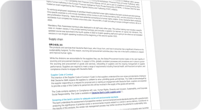 Deutsche Bank Transition toward a sustainable and climate-neutral economy Non-Financial Report 2022 Human rights The Anti-Financial Crime human rights working group, which is part of the above-described bank-wide Human Rights Forum, was established in 2021 to develop and pursue concrete measures and initiatives within the Anti-Financial Crime function to fight modern slavery and human trafficking. As a practical example of the progress made in 2022, modern slavery and human trafficking related key risk drivers were incorporated within Deutsche Bank’s Non-Financial Risk Taxonomy. This is going to further support the enhancement of Deutsche Bank’s control framework. Independent of the working group the Anti-Financial Crime department pro-actively contributed to initiatives within several Public Private Partnerships. Deutsche Bank is currently leading the workstream “Financial Flows of Human Trafficking” within the German Public Privat Partnership Anti-Financial Crime Alliance (AFCA) and is part of a taskforce covering among other topics human trafficking in the Europol Financial Intelligence Public Private Partnership (EFIPPP). In October 2022 the bank hosted an event organized by the Finance Against Slavery and Trafficking (FAST) initiative. To reinforce employees’ awareness of activities linked to potential human rights violations the bank conducts periodic trainings. One specific example is a 45-minute mandatory online course on anti-money laundering (AML) and the prevention of terrorist and proliferation financing - topics that have potential connections to human rights violation. Every Deutsche Bank employee worldwide must complete the module once every year. Around 99% of staff (including in-scope contingent workers) did so in 2022. Mandatory Risk Awareness training is also deployed to all staff every other year. This online training now includes a specific case on modern slavery in the private banking business and includes a question for learners on typical risk indicators. This updated course was launched in the fourth quarter of 2022 to English speaking staff and is going to be rolled out as translated versions in non-English speaking locations at the beginning of the second quarter 2023. Supply chain GRI 2-6/25, 3-3 The products and services that Deutsche Bank buys, who it buys from, and how it consumes has a significant influence on its sustainability footprint. For this reason, sourcing and procurement activities play a key role in the bank’s ambitions to respect and improve human rights. While the divisions are accountable for the suppliers they use, the Global Procurement function leads on the vast majority of sourcing and procurement decisions. In support of this, globally consistent processes and procedures are in place to govern the sourcing and procurement of goods and services, onboarding of suppliers and the ongoing management of supplier performance. Suppliers are required to meet a range of requirements including financial health, anti-fraud and corruption, and compliance checks to engage with Deutsche Bank. Supplier Code of Conduct The intention of the Supplier Code of Conduct (“Code”) is that suppliers understand the core values and standards of behavior that Deutsche Bank expects its suppliers to conform to when providing goods and services. The Code is acknowledged by the supplier responding to a request for proposal and on starting an engagement with Deutsche Bank, suppliers are expected to provide a copy of this Code to its personnel who will be involved in the supply of the goods and services. The Code contains sections on Compliance with Law, Human Rights, Diversity and Inclusion, Sustainability, and Corporate (*). Social Responsibility. The Code is available on Deutsche Bank’s public supplier portal Screening of the bank’s vendors for adequate social and environmental standards The bank undertakes the assessment of prospective vendors’ environmental and social standards starting with a questionnaire analyzing the significance of potential social or environmental impacts related to a vendor’s service delivery. Conditional on the results of this analysis, the vendor risk management process may further scrutinize the potential for sustainability risks. For vendors, with which Deutsche Bank spend more than € 500,000 annually vendor balanced scorecards were launched. These scorecards evaluate vendors across a holistic set of key performance indicators. This evaluation includes a sustainability performance indicator which is either the rating score provided by EcoVadis or the vendor can use an equivalent reputable sustainability rating agency. From July 2022, the prerequisite for every new or prolonged contract worth more than € 500,000 a year is that the vendor has an external sustainability rating from EcoVadis or other rating agencies (*). To that end, the bank maintains a registration website (*) where vendors can obtain relevant information and start their assessments with the sustainability rating agency, EcoVadis. 59