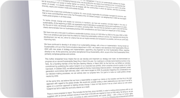 Dear Readers, The Russian war of aggression in Ukraine, the energy crisis and the rapid rise in inflation have dominated the year 2022. All of these developments have once again made us aware of the wide range of risks we are exposed to – as an economy and society as a whole, but also each company individually. For us at Deutsche Bank, robust and comprehensive risk management is a cornerstone of our business. This has long since encompassed more than credit, market and other financial risks. Non-financial risks have become an integral part of our risk management. If we do not systematically address the threats posed by climate change or increasing financial crime, we are putting the very basis of our business at risk. It is essential that we do everything in our power to further tighten our controls. This is also a key element in living up to our claim to be at the center of society. It is equally essential that we engage with the communities in which we operate, and that we promote diversity, equity and inclusion inside and outside the bank. We want to be a bank that contributes to a greener (E), more socially responsible (S) and better managed (G) economy, and that is more committed than ever to the Ten Principles of the UN Global Compact. I am delighted that in 2022 we once again made great progress in all these areas. To tackle climate change and enable our economy to transform, we have set ourselves concrete targets in the area of sustainability. At the beginning of 2020, we expected to reach € 200 billion in sustainable finance and investments in six years. By the end of 2022, we already achieved € 215 billion, excluding DWS. The fact that we reached our goal in only half the time clearly demonstrates how our businesses prioritize ESG considerations and have made it an integral part of their strategy. We have now set a new goal; to achieve a sustainable business volume of € 500 billion by 2025 for the years 2020 to 2025. This is an ambitious goal given that the criteria for measuring sustainability continue to evolve. Our regulators are driving this development, but we, too, strive for criteria that are as impact-oriented and transparent as possible, and we are continually improving here. We have continued to develop in all areas of our sustainability strategy, with a focus on implementation. Having moved our Sustainability unit out of the Communications department in 2021, we created a new standalone Chief Sustainability Office in 2022 with new areas of strategy and implementation, appointing Jörg Eigendorf as Chief Sustainability Officer, reporting directly to me. At the same time, we further strengthened Group Sustainability, which, as part of the Chief Sustainability Office, primarily comprises policies and controls. This further sharpened focus means that we can develop and implement our strategy even faster; we demonstrated our progress at our second Sustainability Deep Dive in March this year. Our roadmap to a climate-neutral banking business is key here. As a founding member of the Net-Zero Banking Alliance, in March 2022, for the first time, we fulfilled our voluntary commitment by publishing the carbon footprint of our corporate loan portfolio, which comprises around a quarter of our total loan book. In October 2022, we defined target paths for the four most energy-intensive sectors – oil and gas (upstream); power generation; automotives (light vehicles); steel – with interim targets for 2030. By gradually integrating CO considerations into 2 our decision-making processes, we can actively steer our progress here. Our goal is to make our credit portfolio climate- neutral by 2050. At the same time, we believe that we have a responsibility to support our clients on this transition and that this is the right approach with regard to the global climate. We would only consider ending a client relationship as a last resort if we fail to agree on a common approach to fighting climate change. It does not help anyone if we as a bank reduce our own carbon footprint but fail to make the world any cleaner as a result. There is more progress to report. This includes the fact that, since mid-2022, in order to continue doing business with us, our suppliers with an annual contract volume of more than € 500,000 are required to have an ESG rating. By doing so, we are designing our entire value chain according to strict environmental and social criteria – with a focus on human rights. Accordingly, we have implemented all obligations under the German Supply Chain Due Diligence Act on time and will continue to do so consistently. As a bank with a global network, we are aware of our responsibility for fighting financial crime on the front lines. That is why we have stepped up our commitment to anti-financial crime by focusing more people on these issues, improving processes and establishing external partnerships. In 2022, for example, we increased our Anti-Financial Crime department by more than 340 to over 1,900 employees, and in mid-2022 Management Board member Stefan Simon took over as a member of the Board of the Anti-Financial Crime Alliance (AFCA). 3