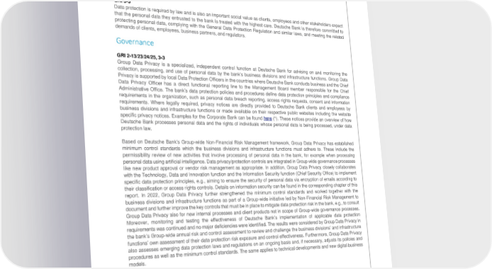 Deutsche Bank Governance and operations Non-Financial Report 2022 Data protection Data protection – Completing review of vendor contract portfolio to comply with Schrems II – No personal data breaches with material impact to individuals observed GRI 3-3 Data protection is required by law and is also an important social value as clients, employees and other stakeholders expect that the personal data they entrusted to the bank is treated with the highest care. Deutsche Bank is therefore committed to protecting personal data, complying with the General Data Protection Regulation and similar laws, and meeting the related demands of clients, employees, business partners, and regulators. Governance GRI 2-13/23/24/25, 3-3 Group Data Privacy is a specialized, independent control function at Deutsche Bank for advising on and monitoring the collection, processing, and use of personal data by the bank’s business divisions and infrastructure functions. Group Data Privacy is supported by local Data Protection Officers in the countries where Deutsche Bank conducts business and the Chief Data Privacy Officer has a direct functional reporting line to the Management Board member responsible for the Chief Administrative Office. The bank’s data protection policies and procedures define data protection principles and compliance requirements in the organization, such as personal data breach reporting, access rights requests, consent and information requirements. Where legally required, privacy notices are directly provided to Deutsche Bank clients and employees by business divisions and infrastructure functions or made available on their respective public websites including the website *). These notices provide an overview of how specific privacy notices. Examples for the Corporate Bank can be found here ( Deutsche Bank processes personal data and the rights of individuals whose personal data is being processed, under data protection law. Based on Deutsche Bank’s Group-wide Non-Financial Risk Management framework, Group Data Privacy has established minimum control standards which the business divisions and infrastructure functions must adhere to. These include the permissibility review of new activities that involve processing of personal data in the bank, for example when processing personal data using artificial intelligence. Data privacy/protection controls are integrated in Group-wide governance processes like new product approval or vendor risk management as appropriate. In addition, Group Data Privacy closely collaborates with the Technology, Data and Innovation function and the Information Security function (Chief Security Office) to implement specific data protection principles, e.g., aiming to ensure the security of personal data via encryption of emails according to their classification or access rights controls. Details on information security can be found in the corresponding chapter of this report. In 2022, Group Data Privacy further strengthened the minimum control standards and worked together with the business divisions and infrastructure functions as part of a Group-wide initiative led by Non-Financial Risk Management to document and further improve the key controls that must be in place to mitigate data protection risk in the bank, e.g., to consult Group Data Privacy also for new internal processes and client products not in scope of Group-wide governance processes. Moreover, monitoring and testing the effectiveness of Deutsche Bank’s implementation of applicable data protection requirements was continued and no major deficiencies were identified. The results were considered by Group Data Privacy in the bank’s Group-wide annual risk and control assessment to review and challenge the business divisions’ and infrastructure functions’ own assessment of their data protection risk exposure and control effectiveness. Furthermore, Group Data Privacy also assesses emerging data protection laws and regulations on an ongoing basis and, if necessary, adjusts its policies and procedures as well as the minimum control standards. The same applies to technical developments and new digital business models. Training and awareness GRI 2-24, 3-3, 404-2, FS4 Employee training on the implications of data protection/privacy laws for the bank’s day-to-day business is a key factor in ensuring adequate data protection in all operating processes. Deutsche Bank requires mandatory data protection training for all employees including eligible contractor staff. This training encompasses the content of the data protection and privacy policy, the key requirements to ensure compliance with applicable legal rules for handling personal data and what steps must be taken in the event of a personal data breach. For Deutsche Bank employees, failure to complete this training and late completion can result in disciplinary consequences. The bank continually assesses its data protection training offering to strengthen data protection culture and updates the training as necessary. Within 2022, an eLearning completion rate of 99,96% was achieved for the mandatory data protection training. 91