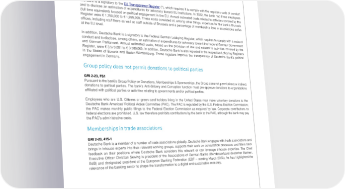 Deutsche Bank Governance and operations Non-Financial Report 2022 Public policy and regulation In addition, Deutsche Bank has a global policy in place to ensure that its communications with supervisory authorities are consistent. Regarding engagements in political dialogue, all employees must adhere to the bank’s global Anti-Bribery and Corruption Policy. This policy lays out rules for the offering and acceptance of gifts by Deutsche Bank employees, employees’ participation in events organized by third parties, and the associated record keeping. Financial transparency GRI 415-1 (*), which requires it to comply with the register’s code of conduct The bank is a signatory to the EU Transparency Register and to disclose an estimation of expenditures for advocacy toward EU institutions. In 2022, the bank had three employees (full time equivalent) focused on political engagement in the EU. Annual estimated costs related to activities covered by the Register were € 1,750,000 to € 1,999,999. These costs consisted of, among other things, expenses for the bank‘s Brussels offices, including staff there as well as staff outside of Brussels and a percentage of membership fees in associations active at the EU level. In addition, Deutsche Bank is a signatory to the Federal German Lobbying Register, which requires to comply with a code of conduct and to disclose, among others, an estimation of expenditures for advocacy toward the Federal German Government and German Parliament. Annual estimated costs, based on the provision of law and related to activities covered by the Register, were € 3,570,001 to € 3,580,000. In addition, Deutsche Bank is also reported in the respective Lobbying Registers in the States of Bavaria and Baden-Württemberg. Those registers improve the transparency of Deutsche Bank’s political engagement in Germany. Group policy does not permit donations to political parties GRI 2-23, FS1 Pursuant to the bank’s Group Policy on Donations, Memberships & Sponsorships, the Group does not permit direct or indirect donations to political parties. The bank’s Anti-Bribery and Corruption function must pre-approve donations to organizations affiliated with political parties or activities relating to governments and/or political parties. Employees who are U.S. Citizens or green card holders living in the United States may make voluntary donations to the Deutsche Bank Americas’ Political Action Committee (PAC). The PAC is regulated by the U.S. Federal Election Commission; the PAC makes monthly public filings to the Federal Election Commission as required by law. Corporate contributions to federal elections are prohibited. U.S. law therefore prohibits contributions by the bank to the PAC, although the bank may pay the PAC’s administrative costs. Memberships in trade associations GRI 2-28, 415-1 Deutsche Bank is a member of a number of trade associations globally. Deutsche Bank engages with trade associations and brings in inhouse experts into their relevant working groups, supports their work on consultation processes and filters back feedback on their positions where Deutsche Bank considers this relevant or can leverage inhouse expertise. The Chief Executive Officer Christian Sewing is president of the Associations of German Banks (Bundesverband deutscher Banken, BdB) and designated president of the European Banking Federation (EBF – starting March 2023), he has highlighted the relevance of the banking sector to shape the transformation to a digital and sustainable economy. 82