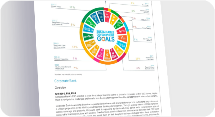 Deutsche Bank Transition toward a sustainable and climate-neutral economy Non-Financial Report 2022 Sustainable finance 1 Numbers may not add up due to rounding Corporate Bank Overview GRI 201-2, FS3, FS14 Corporate Bank’s ESG ambition is to be the strategic financing partner of choice for corporates on their ESG journey, helping them to navigate the challenges and benefits from the long-term opportunities of the transition towards a low-carbon economy. Corporate Bank is servicing the entire corporate client universe with strong relationships to its multinational corporations and a unique proposition in the MidCorp and Business Banking client segment. Through a global network of ESG champions across coverage and products, Corporate Bank is supporting its clients with ESG advice and a comprehensive suite of sustainable financing solutions and services. The champions work in collaboration with the central Corporate Bank ESG Client Solutions team to engage with clients and assist them on their long-term business strategies with a focus on transition financing. The team further provides guidance and industry specific expertise, develops materials and training, and drives the implementation of the ESG strategy in close coordination with other businesses and functions. The Global Head of ESG Corporate Bank is a member of the Corporate Bank executive committee and is mandated to drive ESG across the entire Corporate Bank franchise. In 2022, Corporate Bank provided sustainable financing solutions of € 13 billion, conducted training of its client facing staff and provided continuous ESG news flow. Furthermore, Corporate Bank extended its ESG-enabled product suite and service for its MidCorp and Business Banking clients and established a sustainable supply chain finance program, which enables clients to improve ESG accountability and transparency across their supply chain. 23
