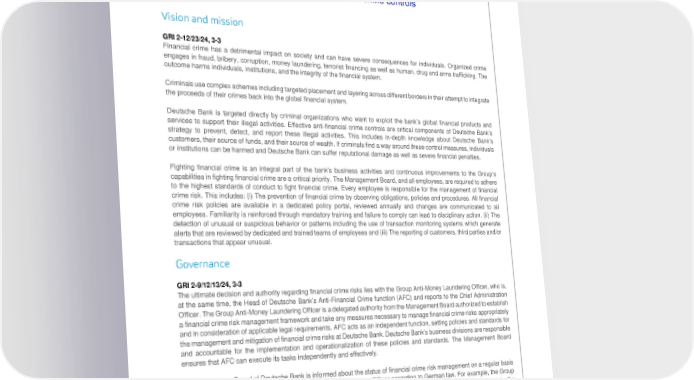 Deutsche Bank Governance and operations Non-Financial Report 2022 Anti-financial crime Anti-financial crime – Preventing, deterring, detecting and reporting financial crime – Maintaining a regular dialogue with supervisory control functions – Continuing to increase investments in financial crime controls Vision and mission GRI 2-12/23/24, 3-3 Financial crime has a detrimental impact on society and can have severe consequences for individuals. Organized crime engages in fraud, bribery, corruption, money laundering, terrorist financing as well as human, drug and arms trafficking. The outcome harms individuals, institutions, and the integrity of the financial system. Criminals use complex schemes including targeted placement and layering across different borders in their attempt to integrate the proceeds of their crimes back into the global financial system. Deutsche Bank is targeted directly by criminal organizations who want to exploit the bank’s global financial products and services to support their illegal activities. Effective anti-financial crime controls are critical components of Deutsche Bank’s strategy to prevent, detect, and report these illegal activities. This includes in-depth knowledge about Deutsche Bank’s customers, their source of funds, and their source of wealth. If criminals find a way around these control measures, individuals or institutions can be harmed and Deutsche Bank can suffer reputational damage as well as severe financial penalties. Fighting financial crime is an integral part of the bank’s business activities and continuous improvements to the Group’s capabilities in fighting financial crime are a critical priority. The Management Board, and all employees, are required to adhere to the highest standards of conduct to fight financial crime. Every employee is responsible for the management of financial crime risk. This includes: (i) The prevention of financial crime by observing obligations, policies and procedures. All financial crime risk policies are available in a dedicated policy portal, reviewed annually and changes are communicated to all employees. Familiarity is reinforced through mandatory training and failure to comply can lead to disciplinary action. (ii) The detection of unusual or suspicious behavior or patterns including the use of transaction monitoring systems which generate alerts that are reviewed by dedicated and trained teams of employees and (iii) The reporting of customers, third parties and/or transactions that appear unusual. Governance GRI 2-9/12/13/24, 3-3 The ultimate decision and authority regarding financial crime risks lies with the Group Anti-Money Laundering Officer, who is, at the same time, the Head of Deutsche Bank’s Anti-Financial Crime function (AFC) and reports to the Chief Administration Officer. The Group Anti-Money Laundering Officer is a delegated authority from the Management Board authorized to establish a financial crime risk management framework and take any measures necessary to manage financial crime risks appropriately and in consideration of applicable legal requirements. AFC acts as an independent function, setting policies and standards for the management and mitigation of financial crime risks at Deutsche Bank. Deutsche Bank’s business divisions are responsible and accountable for the implementation and operationalization of these policies and standards. The Management Board ensures that AFC can execute its tasks independently and effectively. The Supervisory Board of Deutsche Bank is informed about the status of financial crime risk management on a regular basis by the Management Board and the Group Anti-Money Laundering Officer according to German law. For example, the Group Anti-Money Laundering Officer and the responsible Management Board member provided quarterly updates to the Supervisory Board’s Audit Committee. The Supervisory Board and Management Board execute strong engagement and tone from the top with focus on compliance and financial crime risk matters in key committees. The Supervisory Board is well staffed and equipped to oversee the bank’s efforts in this regard. Since 2020, the Supervisory Board has set-up a dedicated Financial Crime Risk Working Group to conduct additional monitoring and to provide holistic advice to the Management Board for the purpose of remedying shortcomings in the Anti-Money Laundering function. In 2022, the Regulatory Oversight Committee has been established, which is mandated to provide central oversight across regulatory engagement and remediation across the bank. 85