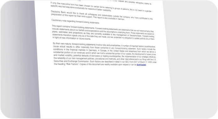 Deutsche Bank Appendix Non-Financial Report 2022 Imprint/Publications Editorial comment All the information in this report has been compiled in good faith and with the greatest care from various sources. To the best of the bank’s knowledge, the information and data contained in this report reflect the truth. Nevertheless, the bank cannot assume liability for the correctness or completeness of the information provided herein. The publisher has made an effort to clarify all reproduction rights. Kindly request any possible retroactive claims to . [email protected] If only the masculine form has been chosen for certain terms referring to groups of persons, this is not meant in a gender- specific way but was done exclusively for reasons of better readability. Deutsche Bank would like to thank all colleagues and stakeholders outside the company who have contributed to the preparation of this report for their kind support. This report is also available in German. Cautionary note regarding forward-looking statements This report contains forward-looking statements. Forward-looking statements are statements that are not historical facts; they include statements about our beliefs and expectations and the assumptions underlying them. These statements are based on plans, estimates and projections as they are currently available to the management of Deutsche Bank. Forward-looking statements therefore speak only as of the date they are made, and we undertake no obligation to update publicly any of them in light of new information or future events. By their very nature, forward-looking statements involve risks and uncertainties. A number of important factors could therefore cause actual results to differ materially from those contained in any forward-looking statement. Such factors include the conditions in the financial markets in Germany, in Europe, in the United States and elsewhere from which we derive a substantial portion of our revenues and in which we hold a substantial portion of our assets, the development of asset prices and market volatility, potential defaults of borrowers or trading counterparties, the implementation of our strategic initiatives, the reliability of our risk management policies, procedures and methods, and other risks referenced in our filings with the U.S. Securities and Exchange Commission. Such factors are described in detail in our SEC Form 20-F of March 17, 2023 under . the heading “Risk Factors”. Copies of this document are readily available upon request or can be downloaded 173