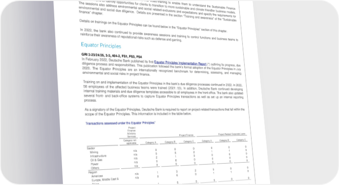 Deutsche Bank Transition toward a sustainable and climate-neutral economy Non-Financial Report 2022 Environmental and social due diligence Training and awareness GRI 2-24, 3-3, 404-2, FS4 Training is essential to raise the bank’s employees’ awareness and enable them to better identify environmental and social risks and opportunities and consequently assess and refer transactions to Group Sustainability. In 2022, Deutsche Bank continued its employee training program. In 2022 front-office staff continued to receive live video-training to enable them to understand the Sustainable Finance Framework and to identify opportunities for clients to transition to more sustainable and climate friendlier business models. The sessions also address environmental and social related exclusions and expectations and specify the requirements for environmental and social due diligence. Details are presented in the section “Training and awareness” of the “Sustainable finance” chapter. Details on trainings on the Equator Principles can be found below in the “Equator Principles” section of this chapter. In 2022, the bank also continued to provide awareness sessions and training to control functions and business teams to reinforce their awareness of reputational risks such as defense and gaming. Equator Principles GRI 2-23/24/25, 3-3, 404-2, FS1, FS3, FS4 In February 2022, Deutsche Bank published its first Equator Principles Implementation Report (*) outlining its progress, due diligence process and responsibilities. This publication followed the bank’s formal adoption of the Equator Principles in July 2020. The Equator Principles are an internationally recognized benchmark for determining, assessing, and managing environmental and social risks in project finance. Training on and implementation of the Equator Principles in the bank’s due diligence processes continued in 2022. In 2022, 58 employees of the affected business teams were trained (2021: 53). In addition, Deutsche Bank continued developing internal training materials and due diligence templates accessible to all employees in the front office. The bank also updated several front- and back-office systems to capture Equator Principles transactions as well as set up an internal reporting process. As a signatory of the Equator Principles, Deutsche Bank is required to report on project-related transactions that fall within the scope of the Equator Principles. This information is included in the table below. Transactions assessed under the Equator Principles1 Project Finance Advisory Services Project Finance Project-Related Corporate Loans Category not applicable Category A Category B Category C Category A Category B Category C Sector Mining n/a 0 0 0 0 0 0 Infrastructure n/a 0 5 2 1 1 0 Oil & Gas n/a 2 1 0 0 0 0 Power n/a 0 8 0 0 0 0 Others n/a 0 0 0 0 0 0 Region Americas n/a 1 3 2 0 0 0 Europe, Middle East & n/a 0 6 0 1 1 0 Africa Asia Pacific n/a 1 5 0 0 0 0 Country Designation Designated Country n/a 1 12 2 0 0 0 Non-Designated n/a 1 2 0 1 1 0 Country Independent Review Yes n/a 1 3 1 1 0 0 No n/a 1 11 1 0 1 0 Total n/a 2 14 2 1 1 0 1 Please note that the figures of this table may also be included in the table “Transactions and clients reviewed under the ES Policy Framework”, see the sub-chapter “ES Policy Framework” The Equator Principles apply only to a limited number of transactions depending on the financial product, volume of transaction and in some cases if further criteria of eligibility are met. Eligible transactions are reported if they have reached financial close. Project categorization follows the International Finance Corporation’s (IFC) environmental and social categorisation process. Category A – projects with potential significant adverse environmental and social risks and/or impacts that are diverse, irreversible, or unprecedented. Category B – projects with potential limited adverse environmental and social risks and/or impacts that are few in number, generally site-specific, largely reversible, and readily addressed through mitigation measures. Category C – projects with minimal or no adverse environmental and social risks and/or impacts. 56