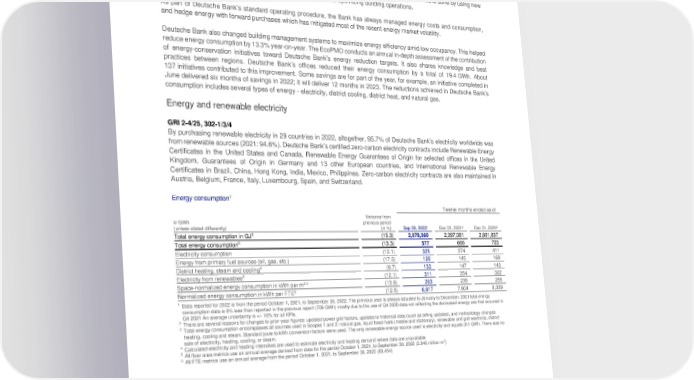 Deutsche Bank Transition toward a sustainable and climate-neutral economy Non-Financial Report 2022 In-house ecology Key topics in 2022 Energy efficiency and conservation GRI 2-25, 3-3, 302-4 Deutsche Bank continually enhances buildings’ energy efficiency and reduce energy consumption. This is done by using new and more efficient technology, recommissioning equipment, and optimizing building operations. As part of Deutsche Bank’s standard operating procedure, the Bank has always managed energy costs and consumption, and hedge energy with forward purchases which has mitigated most of the recent energy market volatility. Deutsche Bank also changed building management systems to maximize energy efficiency amid low occupancy. This helped reduce energy consumption by 13.3% year-on-year. The EcoPMO conducts an annual in-depth assessment of the contribution of energy-conservation initiatives toward Deutsche Bank’s energy reduction targets. It also shares knowledge and best practices between regions. Deutsche Bank’s offices reduced their energy consumption by a total of 19.4 GWh. About 137 initiatives contributed to this improvement. Some savings are for part of the year, for example, an initiative completed in June delivered six months of savings in 2022; it will deliver 12 months in 2023. The reductions achieved in Deutsche Bank’s consumption includes several types of energy - electricity, district cooling, district heat, and natural gas. Energy and renewable electricity GRI 2-4/25, 302-1/3/4 By purchasing renewable electricity in 29 countries in 2022, altogether, 95.7% of Deutsche Bank’s electricity worldwide was from renewable sources (2021: 94.6%). Deutsche Bank’s certified zero-carbon electricity contracts include Renewable Energy Certificates in the United States and Canada, Renewable Energy Guarantees of Origin for selected offices in the United Kingdom, Guarantees of Origin in Germany and 13 other European countries, and International Renewable Energy Certificates in Brazil, China, Hong Kong, India, Mexico, Philippines. Zero-carbon electricity contracts are also maintained in Austria, Belgium, France, Italy, Luxembourg, Spain, and Switzerland. Energy consumption1 Twelve months ended as of Variance from in GWh previous period (unless stated differently) (in %) Sep 30, 2022¹ Dec 31, 2021² Dec 31, 2020² 3 Total energy consumption in GJ (13.3) 2,078,060 2,397,381 2,601,837 3 Total energy consumption (13.3) 577 666 723 Electricity consumption (13.1) 325 374 411 Energy from primary fuel sources (oil, gas, etc.) (17.5) 120 145 169 4 District heating, steam and cooling (9.7) 133 147 143 Electricity from renewables3 (12.1) 311 354 322 2 5 Space-normalized energy consumption in kWh per m (13.8) 203 235 255 6 Normalized energy consumption in kWh per FTE (12.5) 6,917 7,904 8,339 1 Data reported for 2022 is from the period October 1, 2021, to September 30, 2022. The previous year is always adjusted to January to December. 2021 total energy consumption data is 6% less than reported in the previous report (709 GWh) mostly due to the use of Q4 2020 data not reflecting the decreased energy use that occurred in Q4 2021 An average uncertainty is +/- 10% for all KPIs. 2 There are several reasons for changes to prior-year figures: updated power grid factors, updates to historical data (such as billing updates), and methodology changes 3 Total energy consumption encompasses all sources used in Scopes 1 and 2: natural gas, liquid fossil fuels (mobile and stationary), renewable and grid electricity, district heating, cooling and steam. Standard joule to kWh conversion factors were used. The only renewable energy source used is electricity and equals 311 GWh. There was no sale of electricity, heating, cooling, or steam. 4 Calculated electricity and heating intensities are used to estimate electricity and heating demand where data are unavailable 5 2 All floor area metrics use an annual average derived from data for the period October 1, 2021, to September 30, 2022 (2.846 million m ) 6 All FTE metrics use an annual average from the period October 1, 2021, to September 30, 2022 (83,454) 64