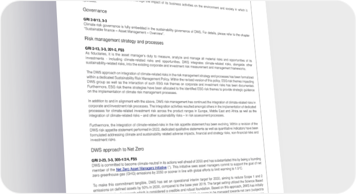 Deutsche Bank Transition toward a sustainable and climate-neutral economy Non-Financial Report 2022 Climate risk Climate risk in Asset Management GRI 3-3, FS5 For DWS, the bank’s Asset Management arm, climate risks mainly arise from its fiduciary activity. Therefore, DWS aims to measure, analyze, and manage material risks and opportunities that may impact its clients’ investments and to make its clients aware of these issues to enable them to make sustainable investment decisions. At the same time, DWS seeks to manage the impact of its business activities on the environment and society in which it operates. Governance GRI 2-9/13, 3-3 Climate risk governance is fully embedded in the sustainability governance of DWS. For details, please refer to the chapter “Sustainable finance – Asset Management – Overview”. Risk management strategy and processes GRI 2-13, 3-3, 201-2, FS3 As fiduciaries, it is the asset manager’s duty to measure, analyze and manage all material risks and opportunities of its investments - including climate-related risks and opportunities. DWS integrates climate-related risks, alongside other sustainability-related risks, into the existing corporate and investment risk measurement and management frameworks. The DWS approach on integration of climate-related risks in the risk management strategy and processes has been formalized within a dedicated Sustainability Risk Management Policy. Within the revised version of this policy, ESG risk themes impacting DWS group as well as the interaction of such ESG risk themes on corporate and investment risks has been documented. Furthermore, ESG risk theme strategies have been allocated to the identified ESG risk themes to provide strategic guidance on the implementation of climate risk management processes. In addition to and in alignment with the above, DWS risk management has continued the integration of climate-related risks in corporate and investment risk processes. The integration activities resulted amongst others in the implementation of dedicated processes for climate-related investment risk across the product ranges in Europe, Middle East and Africa as well as the integration of climate-related risks – and other sustainability risks – in risk assessment processes. Furthermore, the integration of climate-related risks in the risk appetite statement has been evolving. Within a revision of the DWS risk appetite statement performed in 2022, dedicated qualitative statements as well as quantitative indicators have been formulated addressing climate and sustainability related adverse impacts, financial and strategy risks, non-financial risks and investment risks. DWS approach to Net Zero GRI 2-23, 3-3, 305-1/2/4, FS5 DWS is committed to become climate-neutral in its actions well ahead of 2050 and has substantiated this by being a founding (*). This initiative sees asset managers commit to support the goal of net member of the Net Zero Asset Managers initiative zero greenhouse gas (GHG) emissions by 2050 or sooner in line with global efforts to limit warming to 1.5°C. To make this commitment tangible, DWS has set an operational interim target for 2030, aiming to reduce Scope 1 and 2 emissions on defined assets by 50% in 2030, compared to the base year 2019. The target setting utilized the Science Based Targets Initiative framework which is considered a credible and robust foundation. Based on this approach, DWS has initially put 35.4% or € 281.2 billion of its total AuM as per December 31, 2020, in scope to be managed towards net zero (subject to the consent of clients, legal entities, and fund boards). As of December 31, 2021, 38.6% or € 358.0 billion AuM are in scope of net zero. In 2022 DWS reported a 6.3% reduction in the inflation adjusted “net” Weighted Average Carbon Intensity of the assets in- scope. By comparison, the Weighted Average Carbon Intensity of the MSCI All-Country World Index over the same year saw an inflation adjusted decline of just 0.3%. The non-inflation adjusted “gross” Weighted Average Carbon Intensity reduction was 7.4%, i.e., 1.2% of the reduction was inflation driven. The Weighted Average Carbon Intensity is currently only calculated for liquid in-scope AuM where carbon data is available from current vendors. Illiquid assets in scope for net zero (€ 29.3 billion as of year end 2021) are currently not part of the Weighted Average Carbon Intensity calculation. The 6.3% decrease is derived as follows: (1-7.4%) x (1+1.2%)-1=-6.3%. 50