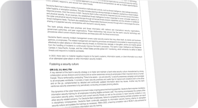 Deutsche Bank Technology, data and innovation Non-Financial Report 2022 Information security Security measures Layered security controls GRI 3-3 To fend off evolving security threats, the bank aims to build information security controls into every layer of technology, including identity, data, infrastructure, devices and applications, complemented by organizational controls and security training and awareness. The purpose of this layered approach is to provide end-to-end protection as well as multiple opportunities to detect, prevent, respond to, and recover from cyber threats. Deutsche Bank has in place a variety of prevention methods and controls, such as threat intelligence, data leakage prevention, cyber hygiene, or encryption solutions. This also includes placing a strong emphasis on detection, backed by a robust incident- response process. Over the course of 2022, Deutsche Bank further matured its integrated security function across information and physical security. As an example, the established threat intelligence function expanded to cover a broader spectrum of the cyber and physical security threat landscape through enhanced threat analysis capabilities and the utilization of additional threat intelligence feeds. The bank also established a Responsible Disclosure process through which it encourages the active sharing of suspected security vulnerabilities with the bank’s security teams. The bank actively shares best practices and threat information with national and international security organizations, government authorities, and peer organizations. These relationships help ensure that the bank’s security technology and procedures reflect current industry best practices and keep pace with the threat environment. Deutsche Bank’s security incident management covers cyber-security events that may affect itself, its clients and business partners, or employees. The related management and reporting processes are designed to be enabled to respond quickly and effectively to cyber-attacks or information security threats, to minimize loss, leakage, or disruption, and to use insights gained from the handling of incidents to continuously improve the bank’s processes. The bank’s Cyber Intelligence and Response Centers in Asia-Pacific, Europe, and the United States provide global 24/7 monitoring, which enhances its ability to detect threats and respond to incidents worldwide. In 2022, there were no material negative impacts to the bank’s systems, information assets, or client information as a result of an attempted cyber-attack or other information security incident. Fostering a security culture GRI 2-23, 3-3, 404-2, FS4 A key element of the bank’s security strategy is to foster and maintain a bank-wide security culture characterized by strong collaboration across divisions and functions and an active awareness among its employees of their important role as a human firewall. This is reinforced by conducting “Time to be aware – you are security,” a security awareness campaign communicated to all employees worldwide. It consists of basic security practices and useful tips for typical work situations both at the office and on the go, complemented by detailed and continually updated information about key issues. Another way the bank reinforces security awareness is by periodically conducting simulated phishing attacks. The dynamics of the cyber threat environment make ongoing personnel training essential. Deutsche Bank requires mandatory information security training for all employees including eligible contractor staff. This training encompasses the content of the information security policy, important and current security threats as well as the process to report security incidents or any other security-related concerns. For Deutsche Bank employees, failure to complete this training and late completion can result in disciplinary consequences. Deutsche Bank continually assesses its information security training offering to strengthen security culture and updates the trainings as necessary. Within 2022, a learning completion rate of 99,98 % was achieved for the e-Learning-based mandatory information security training. Third-party security risk management GRI 3-3 Reliance on third parties’ products and services that support critical operations can affect the bank’s risk posture, because it can be the target of new and evolving information security attacks. This risk, along with increased regulatory requirements, has necessitated detailed oversight and continuous monitoring of third-party security as well as the continued maturing of the bank’s technology driven third party security capabilities. Deutsche Bank manages information security third-party risk by means of its global third-party risk management program, which includes requisite obligations of information security controls, as applicable. 106