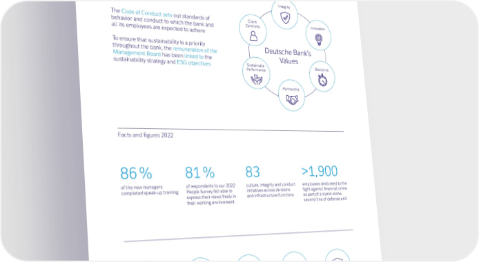 Deutsche Bank Non-Financial Report 2022 Governance and operations at a glance Integrity The Code of Conduct sets out standards of Client Innovation behavior and conduct to which the bank and Centricity all its employees are expected to adhere To ensure that sustainability is a priority Deutsche Bank’s throughout the bank, the remuneration of the Values Management Board has been linked to the sustainability strategy and ESG objectives Sustainable Discipline Performance Partnership Facts and 昀椀gures 2022 86 % 81 % 83 >1,900 of the new managers of respondents to our 2022 culture, integrity and conduct employees dedicated to the completed speak-up training People Survey felt able to initiatives across divisions 昀椀ght against 昀椀nancial crime express their views freely in and infrastructure functions as part of a stand-alone, their working environment second line of defense unit Data protection Anti-昀椀nancial crime Public policy Tax Product responsiblity No personal data Signi昀椀cant increase in No permission of The bank has a clear Tailored controls and breaches with material headcount to protect direct or indirect framework setting out governance in place impact to individuals the bank and society contribution to roles and responsibilities across businesses to observed from 昀椀nancial crime political parties to ensure compliance responsibly design and with the tax obligations o昀昀er products and services to clients 70