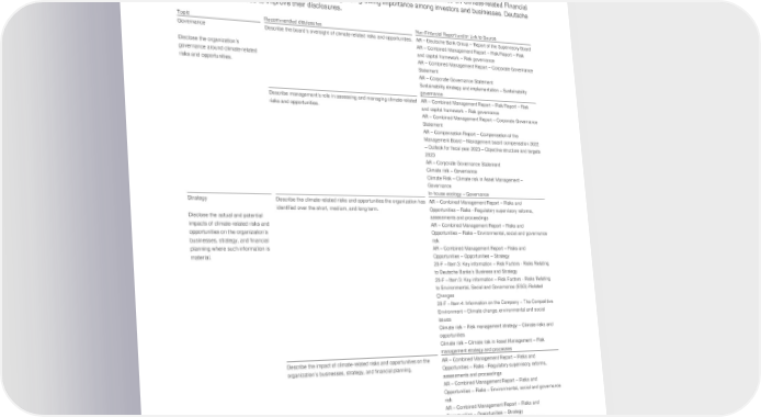 Deutsche Bank Appendix Non-Financial Report 2022 Recommendations of the Task Force on Climate-related Financial Disclosures (TCFD) Recommendations of the Task Force on Climate-related Financial Disclosures (TCFD) In the following table Deutsche Bank shows the chapters and sub-chapters of the Non-Financial Report, the Annual Report (AR), or the SEC Form 20-F (20-F) in which the disclosures recommended by the Task Force on Climate-related Financial Disclosures (TCFD) can be found, thus acknowledging their growing importance among investors and businesses. Deutsche Bank continuously strives to improve their disclosures. Topic Recommended disclosures Non-Financial Report and/or Link to Source Governance Describe the board’s oversight of climate-related risks and opportunities. AR – Deutsche Bank Group – Report of the Supervisory Board AR – Combined Management Report – Risk Report – Risk Disclose the organization’s and capital framework – Risk governance governance around climate-related AR – Combined Management Report – Corporate Governance risks and opportunities. Statement AR – Corporate Governance Statement Sustainability strategy and implementation – Sustainability governance Describe management’s role in assessing and managing climate-related AR – Combined Management Report – Risk Report – Risk risks and opportunities. and capital framework – Risk governance AR – Combined Management Report – Corporate Governance Statement AR – Compensation Report – Compensation of the Management Board – Management board compensation 2022 – Outlook for fiscal year 2023 – Objective structure and targets 2023 AR – Corporate Governance Statement Climate risk – Governance Climate Risk – Climate risk in Asset Management – Governance In-house ecology – Governance Strategy Describe the climate-related risks and opportunities the organization has AR – Combined Management Report – Risks and identified over the short, medium, and long term. Opportunities – Risks - Regulatory supervisory reforms, Disclose the actual and potential assessments and proceedings impacts of climate-related risks and AR – Combined Management Report – Risks and opportunities on the organization’s Opportunities – Risks – Environmental, social and governance businesses, strategy, and financial risk planning where such information is AR – Combined Management Report – Risks and material. Opportunities – Opportunities – Strategy 20-F – Item 3: Key information – Risk Factors - Risks Relating to Deutsche Banks’s Business and Strategy 20-F – Item 3: Key information – Risk Factors - Risks Relating to Environmental, Social and Governance (ESG)-Related Changes 20-F – Item 4: Information on the Company – The Competitive Environment – Climate change, environmental and social issues Climate risk – Risk management strategy – Climate risks and opportunities Climate risk – Climate risk in Asset Management – Risk management strategy and processes Describe the impact of climate-related risks and opportunities on the AR – Combined Management Report – Risks and organization’s businesses, strategy, and financial planning. Opportunities – Risks - Regulatory supervisory reforms, assessments and proceedings AR – Combined Management Report – Risks and Opportunities – Risks – Environmental, social and governance risk AR – Combined Management Report – Risks and Opportunities – Opportunities – Strategy AR – Combined Management Report – Sustainability 20-F – Item 3: Key information – Risk Factors - Risks Relating to Deutsche Bank’s Business and Strategy 20-F – Item 3: Key information – Risk Factors - Risks Relating to Environmental, Social and Governance (ESG)-Related Changes 20-F – Item 4: Information on the Company – The Competitive Environment – Climate change, environmental and social issues Climate risk – Risk management strategy Climate Risk – Climate risk in Asset Management – Risk management strategy and processes Describe the resilience of the organization’s strategy, taking into Climate risk – Risk management framework - Scenario consideration different climate-related scenarios, including a 2°C or analysis and stress testing lower scenario. 151