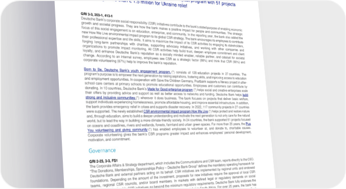 Deutsche Bank Employees and corporate social responsibility Non-Financial Report 2022 Corporate social responsibility Corporate social responsibility – Reaching more than 1.4 million people with Deutsche Bank’s CSR programs in 2022 – Launching the “How We Live” environmental impact program with 51 projects – Providing more than € 1.5 million for Ukraine relief GRI 3-3, 203-1, 413-1 Deutsche Bank’s corporate social responsibility (CSR) initiatives contribute to the bank’s stated purpose of enabling economic growth and societal progress. They are how the bank makes a positive impact for people and communities. The strategic focus of this social engagement is on education, enterprise, and community. In the reporting year, the bank also added the new How We Live environmental impact program to its global CSR strategy. The bank encourages its employees to contribute their professional expertise and life skills. It aims to maximize the impact of its CSR activities by engaging its stakeholders, forging long-term partnerships with charities, supporting advocacy initiatives, and working with other companies and organizations to promote impact monitoring. All CSR activities help build trust, deepen employee commitment and client loyalty, and enhance Deutsche Bank’s reputation as a socially minded enabler, reliable partner, and catalyst for societal change. According to an internal survey, employees see CSR as a strategic factor (86%) and think that CSR (88%) and corporate volunteering (87%) help to improve the bank’s reputation. countries. The Born to Be, Deutsche Bank’s youth engagement program, (*) consists of 128 education projects in 27 program’s purpose is to empower the next generation by raising aspirations, fostering skills, and improving access to education and employment opportunities. In cooperation with Save the Children Germany, Postbank supports a literacy project in after- school care centers at primary schools to promote educational opportunities. Employees and customers can contribute by donating. In 10 countries, Deutsche Bank’s Made for Good enterprise program (*) helps social and creative enterprises scale their offers by providing advice and support as well as better access to networks and funding. Deutsche Bank helps build strong and inclusive communities (*) wherever it does business. The bank focuses on projects that deliver basic welfare, support individuals experiencing homelessness, promote affordable housing, and improve essential infrastructure. In addition, the bank provides emergency relief in crises and supports disaster recovery. In 2022, 117 community projects in 27 countries CSR environmental impact program How We Live (*) helps protect and restore nature were supported. The newly established and, through education, aims to build a deeper understanding and motivate the next generation to not only care for the natural world, but to lead the way in building a more climate-friendly society. In 24 countries, the bank supported 51 projects focused on oceans and coastlines, rivers and wetlands, forests, farmland and urban green spaces. For more than 25 years, the Plus You volunteering and giving community (*) has enabled employees to volunteer at, and donate to, charitable causes. Corporate volunteering gives the bank’s CSR programs greater impact and enhances employees’ personal development, motivation, and commitment. Governance GRI 2-23, 3-3, FS1 The Corporate Affairs & Strategy department, which includes the Communications and CSR team, reports directly to the CEO. “The Donations, Memberships, Sponsorships Policy – Deutsche Bank Group” defines the mandatory operating framework for Deutsche Bank and external partners acting on its behalf. CSR initiatives are implemented by regional units and endowed foundations. Depending on the amount of the investment, proposals for new initiatives require the approval of local CSR teams, regional CSR councils, and/or board members. In markets with defined legal or regulatory demands on social commitment, the bank’s CSR initiatives go beyond the minimum regulatory requirements. Deutsche Bank fully endorses the Companies Act 2013 in India and the Black Economic Empowerment Act in South Africa. For over 25 years, the bank has consistently received an outstanding rating for its Community Reinvestment Act performance from the Federal Reserve Bank of New York. 120