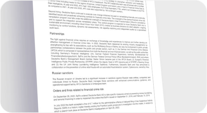 Deutsche Bank Governance and operations Non-Financial Report 2022 Anti-financial crime Key topics in 2022 GRI 3-3 Resources and transformation execution There are dedicated employees within AFC, the business divisions, and Deutsche Bank’s technology function whose main task is to manage financial crime risks. In 2022, AFC initiated a hiring strategy to strengthen execution and leadership capabilities, which led to a substantial increase of AFC’s headcount. The AFC leadership team was enhanced with a number of senior hires including heads for the regions Americas, United Kingdom and Ireland, and a Head of Financial Crime Data & Risk Intelligence. At year end 2022, AFC had 1,932 employees (Full Time Equivalent, FTE), which is an increase of 343 FTE as compared to 2021. At year end 2022, AFC was also supported by 192 contingent workers. Beyond hiring, Deutsche Bank continued to execute core change initiatives focused on remediating internally and externally identified issues and proactively enhancing controls for financial crime risks. The oversight of the central financial crime risk remediation program now falls under the additional oversight of Deutsche Bank’s Chief Transformation Office for consistency and to support the integration across remediation plans. This central program is expected to move Deutsche Bank into a sustainable environment, including robust Know Your Client (KYC) checks by business divisions for client adoption, ongoing monitoring by control functions, dynamic risk assessments, risk appetite matching and independent audits by a specialized audit team. Partnerships The fight against financial crime requires an exchange of knowledge and experiences to improve and further develop an effective management of financial crime risks. In 2022, Deutsche Bank deepened its existing industry engagements by strengthening its ties with its associations, such as the Wolfsberg Group of Banks, but also its involvement in public private partnerships (collaborations between the public and private sector), such as (1) the German Anti Financial Crime Alliance (AFCA) which is composed of representatives from both the financial and non-financial sector, as well as the public authorities including Germany’s Financial Intelligence Unit, German Federal Financial Supervisory Authority (Bundesanstalt für Finanzdienstleistungsaufsicht, BaFin) and the German Federal Criminal Police Office (Bundeskriminalamt, BKA) and where Deutsche Bank’s Management Board member Stefan Simon became part of the AFCA Board; (2) Europol’s Financial Intelligence Public Private Partnership (EFIPPP) where the deputy Head of AFC became part of EFIPPP’s Steering Group and (3) the UK Joint Money Laundering Intelligence Taskforce. Furthermore, Deutsche Bank and Visa announced a collaboration on the prevention of online retail frauds with an automated fraud detection system, Cybersource, owned by Visa. Russian sanctions The Russian invasion of Ukraine led to a significant increase in sanctions against Russian state entities, companies and individuals linked to Russia. Deutsche Bank manages these sanctions with enhanced communications, guidance, and operational support led by AFC’s Sanctions & Embargoes team. Orders and fines related to financial crime risk On September 28, 2022, BaFin ordered Deutsche Bank AG to take specific measures aimed at preventing money laundering and terrorist financing in order to implement the orders that BaFin issued on September 21, 2018, and February 15, 2019. In July 2022 the bank accepted a fine of € 7 million for the administrative offence of delayed filing of two Suspicious Activity Reports (SAR) in a historic matter thereby ending the Frankfurt public prosecutor’s investigation into this matter, in relation to which a search took place at Deutsche Bank’s headquarters on April 29, 2022. Risk exposure and controls GRI 2-23/24/25/26, 3-3, 205-1/2/3, FS1, FS3 Deutsche Bank’s inherent exposure to financial crime risks is influenced by its clients’ footprint and transaction behavior, the geographies in which it operates, the products and services offered, and the sales channels used. The exposure to various financial crime risks is subsumed under money laundering, terrorist financing, sanctions and embargoes, internal and external fraud and bribery and corruption. 86