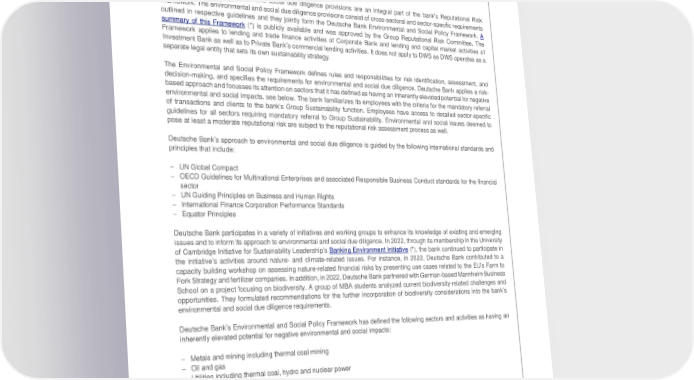 Deutsche Bank Transition toward a sustainable and climate-neutral economy Non-Financial Report 2022 Environmental and social due diligence The Reputational Risk Framework stipulates that certain matters, including those with a potential negative ES impact and those matters linked to the defense or gaming industry, must be reviewed by subject matter experts. These matters are discussed in more detail in the sections below. Environmental and Social Policy Framework GRI 2-23/24/25/27, 3-3, FS1, FS3 Deutsche Bank’s environmental and social due diligence provisions are an integral part of the bank’s Reputational Risk Framework. The environmental and social due diligence provisions consist of cross-sectoral and sector-specific requirements outlined in respective guidelines and they jointly form the Deutsche Bank Environmental and Social Policy Framework. A summary of this Framework (*) is publicly available and was approved by the Group Reputational Risk Committee. The Framework applies to lending and trade finance activities of Corporate Bank and lending and capital market activities of Investment Bank as well as to Private Bank’s commercial lending activities. It does not apply to DWS as DWS operates as a separate legal entity that sets its own sustainability strategy. The Environmental and Social Policy Framework defines rules and responsibilities for risk identification, assessment, and decision-making, and specifies the requirements for environmental and social due diligence. Deutsche Bank applies a risk- based approach and focusses its attention on sectors that it has defined as having an inherently elevated potential for negative environmental and social impacts, see below. The bank familiarizes its employees with the criteria for the mandatory referral of transactions and clients to the bank’s Group Sustainability function. Employees have access to detailed sector-specific guidelines for all sectors requiring mandatory referral to Group Sustainability. Environmental and social issues deemed to pose at least a moderate reputational risk are subject to the reputational risk assessment process as well. Deutsche Bank’s approach to environmental and social due diligence is guided by the following international standards and principles that include: – UN Global Compact – OECD Guidelines for Multinational Enterprises and associated Responsible Business Conduct standards for the financial sector – UN Guiding Principles on Business and Human Rights – International Finance Corporation Performance Standards – Equator Principles Deutsche Bank participates in a variety of initiatives and working groups to enhance its knowledge of existing and emerging issues and to inform its approach to environmental and social due diligence. In 2022, through its membership in the University of Cambridge Initiative for Sustainability Leadership’s Banking Environment Initiative (*), the bank continued to participate in the initiative’s activities around nature- and climate-related issues. For instance, in 2022, Deutsche Bank contributed to a capacity building workshop on assessing nature-related financial risks by presenting use cases related to the EU’s Farm to Fork Strategy and fertilizer companies. In addition, in 2022, Deutsche Bank partnered with German-based Mannheim Business School on a project focusing on biodiversity. A group of MBA students analyzed current biodiversity-related challenges and opportunities. They formulated recommendations for the further incorporation of biodiversity considerations into the bank’s environmental and social due diligence requirements. Deutsche Bank’s Environmental and Social Policy Framework has defined the following sectors and activities as having an inherently elevated potential for negative environmental and social impacts: – Metals and mining including thermal coal mining – Oil and gas – Utilities including thermal coal, hydro and nuclear power – Industrial agriculture and forestry – Chemicals – Industrials and infrastructure projects in certain countries – Other activities either with a high carbon intensity and/or potential for human rights infringements Other industries and sector-specific topics, such as the defense, gaming, and adult entertainment industry, which are inherently considered to carry an enhanced level of social and governance risk, and potentially environmental risk, are covered by the Reputational Risk Framework. Due to geopolitical developments in 2022, there was an increased focus on the defense sector while topical issues such as the digital asset and crypto currency sector as well as tobacco and cannabis were also discussed. Details on the Reputational Risk Framework are presented in the “Governance” section above, and specific due diligence requirements of the mentioned sectors are summarized in the table entitled “Main positions and minimum standards of the environmental and social due diligence” below. 53