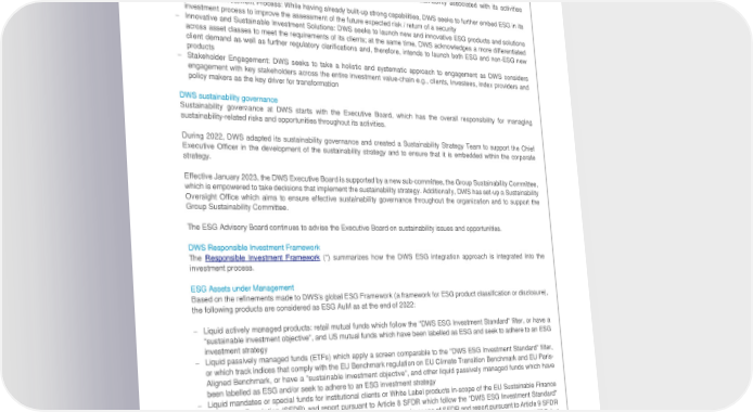 Deutsche Bank Transition toward a sustainable and climate-neutral economy Non-Financial Report 2022 Sustainable finance To mitigate climate change, transformational change is required across all parts of the real economy. Reflecting on the responsibilities as an asset manager in this transformation, DWS is committed to support its clients in managing this transformation by providing expertise and bespoke investment solutions. DWS sustainability strategy is anchored around four strategic priorities. – Corporate Transformation: DWS continues seeking to increase the level of sustainability associated with its activities throughout its organization – ESG in the Investment Process: While having already built-up strong capabilities, DWS seeks to further embed ESG in its investment process to improve the assessment of the future expected risk / return of a security – Innovative and Sustainable Investment Solutions: DWS seeks to launch new and innovative ESG products and solutions across asset classes to meet the requirements of its clients; at the same time, DWS acknowledges a more differentiated client demand as well as further regulatory clarifications and, therefore, intends to launch both ESG and non-ESG new products – Stakeholder Engagement: DWS seeks to take a holistic and systematic approach to engagement as DWS considers engagement with key stakeholders across the entire investment value-chain e.g., clients, investees, index providers and policy makers as the key driver for transformation DWS sustainability governance Sustainability governance at DWS starts with the Executive Board, which has the overall responsibility for managing sustainability-related risks and opportunities throughout its activities. During 2022, DWS adapted its sustainability governance and created a Sustainability Strategy Team to support the Chief Executive Officer in the development of the sustainability strategy and to ensure that it is embedded within the corporate strategy. Effective January 2023, the DWS Executive Board is supported by a new sub-committee, the Group Sustainability Committee, which is empowered to take decisions that implement the sustainability strategy. Additionally, DWS has set-up a Sustainability Oversight Office which aims to ensure effective sustainability governance throughout the organization and to support the Group Sustainability Committee. The ESG Advisory Board continues to advise the Executive Board on sustainability issues and opportunities. DWS Responsible Investment Framework The Responsible Investment Framework (*) summarizes how the DWS ESG integration approach is integrated into the investment process. ESG Assets under Management Based on the refinements made to DWS’s global ESG Framework (a framework for ESG product classification or disclosure), the following products are considered as ESG AuM as at the end of 2022: – Liquid actively managed products: retail mutual funds which follow the "DWS ESG Investment Standard" filter, or have a "sustainable investment objective", and US mutual funds which have been labelled as ESG and seek to adhere to an ESG investment strategy – Liquid passively managed funds (ETFs) which apply a screen comparable to the "DWS ESG Investment Standard" filter, or which track indices that comply with the EU Benchmark regulation on EU Climate Transition Benchmark and EU Paris- Aligned Benchmark, or have a "sustainable investment objective", and other liquid passively managed funds which have been labelled as ESG and/or seek to adhere to an ESG investment strategy – Liquid mandates or special funds for institutional clients or White Label products in-scope of the EU Sustainable Finance Disclosure Regulation (SFDR) and report pursuant to Article 8 SFDR which follow the "DWS ESG Investment Standard" filter or a comparable ESG filter aligned with the client or which are in-scope of SFDR and report pursuant to Article 9 SFDR – Liquid mandates or special funds for institutional clients or White Label products which are out-of-scope of SFDR but comply with certain of the "General Industry Standards and Guidelines for Sustainable Investing" – Illiquid products which are in-scope of SFDR and report pursuant to Article 9 SFDR – Illiquid products which are out-of-scope of SFDR but which have a "sustainable investment objective" 34