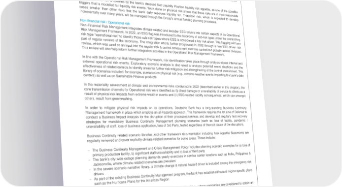 Deutsche Bank Transition toward a sustainable and climate-neutral economy Non-Financial Report 2022 Climate risk Liquidity risk Deutsche Bank uses stress testing and pathway analysis to assess the impact of climate risk on liquidity. In particular, the bank’s stressed Net Liquidity Position scenarios, that are run on a daily basis, include climate disasters as possible triggers of stress (physical risks). In 2022 the bank also developed and ran an internal climate stress test on liquidity, discussed in section “Scenario analysis and stress testing” of this chapter. Physical climate risk is covered by the bank’s stressed Net Liquidity Position liquidity risk appetite, as one of the possible triggers that is modelled for liquidity risk events. Work done on physical risk shows that these risks are in most reasonable cases smaller than other risks that the bank daily reserves liquidity for. Transition risk, which is expected to develop incrementally over many years, will be managed through the Group’s annual funding planning processes. Non-financial risk / Operational risk Non-Financial Risk Management integrates climate-related and broader ESG drivers into certain aspects of its Operational Risk Management Framework. In 2022, an ESG flag was introduced to the taxonomy of sub-risk types under the overarching risk type “operational risk” to identify those sub-risk types where ESG is considered a key risk driver. This flagging will form part of regular reviews of the taxonomy. The integration efforts further progressed in 2022 through a new ESG driven risk review, which was used as an input into the regular risk & control assessment exercise carried out globally across divisions. This review will also help inform further integration activities in the Operational Risk Management Framework. In line with the Operational Risk Management Framework, risk identification takes place through analysis of past internal and external operational risk events. Exploratory scenario analysis is also used to analyze potential event situations and the effectiveness of related controls to identify areas for further risk mitigation and strengthening of the control environment. This library of scenarios included, for example, scenarios on physical risk (e.g., extreme weather events impacting the bank's data centers) as well as on Sustainable Finance products. In the materiality assessment of climate and environmental risks conducted in 2022 (described earlier in this chapter), the core transmission channels for Operational risk were identified as (i) direct damage or unavailability of service to clients as a result of physical risk impacts from extreme weather events and (ii) ESG-related liability consequences, which can amongst others, result from greenwashing. In order to mitigate physical risk impacts on its operations, Deutsche Bank has a long-standing Business Continuity Management framework in place which employs an all-hazards approach. This framework requires the 1st Line of Defense to conduct a Business Impact Analysis for the disruption of their processes/services and develop and regularly test recovery strategies for mandatory Business Continuity Management planning scenarios (such as loss of facility, pandemic / unavailability of staff, loss of business application, loss of 3rd Party, tested regardless of the root cause of the disruption). Business Continuity related scenario libraries and other framework documentation including Risk Appetite Statements are regularly reviewed and cover explicitly climate-related scenarios for some areas. These include: – The Business Continuity Management and Crisis Management Policy includes planning scenario examples for a) loss of primary production facility, b) significant staff unavailability and c) loss of third party – The bank’s city-wide outage planning demands yearly exercises in service center locations such as India, Philippines & Jacksonville, where climate-related scenarios are prevalent – In the severe scenario narrative library, a climate change & natural hazard driver is included among the emergency risk drivers – As part of the existing Business Continuity Management program, the bank has established hazard /region specific plans such as the Hurricane Plans for the Americas Region Regulators have increased their scrutiny on the topic of “greenwashing” (i.e., where companies are considered to obtain an unfair competitive advantage by inaccurately portraying, exaggerating or misleading the selling of and/or contents of products, or their general image, as being ‘environmentally friendly’, green or sustainable). Stringent controls are considered to be a key element to prevent and mitigate the risk of greenwashing. Analysis is therefore underway to review the greenwashing-related regulatory landscape, external events, impacted risk types and internal controls. In addition, work was kicked-off in 2022 that focuses on triggers of potential ESG-related litigations. The outcome of these analyses as well as the business-run ESG driven risk review will be used, where applicable, to enhance the control environment in 2023. Addressing this risk in an adequate manner supports: – Investors’ and society’s trust in the financial industry to support the transformation of the economy towards de-carbonization and sustainability, as envisaged by the European’s Commission Action Plan on Sustainable Finance – Protection of Deutsche Bank’s reputation – Mitigation of the risk of regulatory enforcement or civil litigation 44