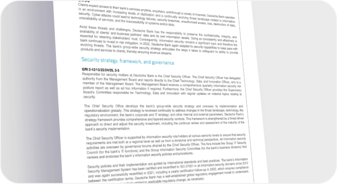 Deutsche Bank Technology, data and innovation Non-Financial Report 2022 Information security Information security – Preserving the confidentiality, integrity, and availability of information assets – Continually adapting security controls based on an evolving threat landscape GRI 3-3 Clients expect access to their bank’s services anytime, anywhere, and through a variety of channels. Deutsche Bank operates in an environment with increasing levels of digitization and a continually evolving threat landscape related to information security. Cyber-attacks could lead to technology failures, security breaches, unauthorized access, loss, destruction of data, unavailability of services, and the inaccessibility of systems and/or data. Amid these threats and challenges, Deutsche Bank has the responsibility to preserve the confidentiality, integrity, and availability of clients’ and business partners’ data and its own information assets. Doing so consistently and effectively is essential for retaining stakeholders’ trust. Consequently, information security remains a significant topic and therefore the bank continues to invest in risk mitigation. In 2022, Deutsche Bank again adapted its security capabilities to keep pace with evolving threats. The bank’s group-wide security strategy articulates the steps it takes to safeguard its ability to provide products and services to clients, thereby ensuring revenue streams. Security strategy, framework, and governance GRI 2-12/13/23/24/25, 3-3 Responsible for security matters at Deutsche Bank is the Chief Security Officer. The Chief Security Officer has delegated authority from the Management Board and reports directly to the Chief Technology, Data, and Innovation Officer, who is a member of the Management Board. The Management Board receives a comprehensive quarterly information security risk posture report as well as ad hoc information if required. Furthermore, the Chief Security Officer provides the Supervisory Board’s Committee responsible for Technology, Data and Innovation with regular updates on material topics relating to security. The Chief Security Office develops the bank’s group-wide security strategy and oversees its implementation and operationalization globally. This strategy is reviewed continually to address changes in the threat landscape, technology, the regulatory environment, the bank’s corporate and IT strategy, and other internal and external parameters. Deutsche Bank’s strategy framework provides comprehensive and layered security controls. This framework is strengthened by a threat-driven approach to direct and adjust the security investment, including the continual review and assessment of the maturity of the bank’s security implementation. The Chief Security Officer is supported by information security role holders at various seniority levels to ensure that security requirements are met both at a regional level as well as from a divisional and technical perspective. All information security activities are overseen by governance forums chaired by the Chief Security Officer. The fora include the Group IT Security Council (for the bank’s IT functions) and the Group Information Security Committee (for the bank’s business divisions) that reviews and endorses the bank´s information security policies and procedures. Security policies and their implementation are guided by international standards and best practices. The bank’s Information Security Management System has been certified and recertified to ISO 27001 in all information security domains since 2012 and was again successfully recertified in 2021, including a yearly certification-follow-up in 2022, which ensures compliance between the certification terms. Deutsche Bank has a well-established global regulatory engagement model to understand, identify and implement controls related to applicable regulatory change, as necessary. The effectiveness of the overall approach to information security is evaluated on a regular basis by third-party organizations that compare the bank’s approach with industry benchmarks. In addition, the independent Group Audit function frequently includes the assessment of security controls in its audit plan. 105