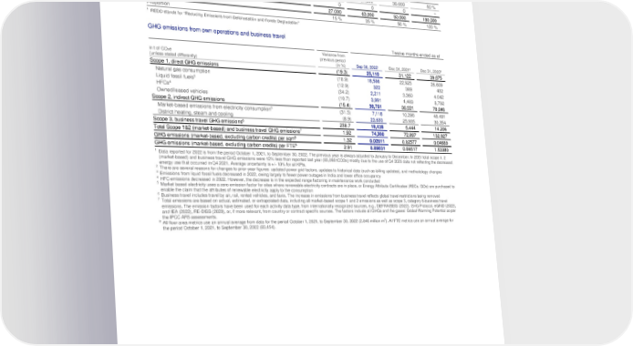 Deutsche Bank Transition toward a sustainable and climate-neutral economy Non-Financial Report 2022 In-house ecology Twelve months ended as of Dec 31,2020 Africa Americas Asia Share Wind energy 0 36,000 27,000 35 % Biomass/biogas 0 0 0 − Efficient cookstoves 0 0 0 − Geothermal energy 0 0 27,000 15 % Hydropower 0 0 0 − 1 Sustainable forest management/REDD 27,000 27,000 36,000 50 % Solar energy/photovoltaics 0 0 0 − Total 27,000 63,000 90,000 180,000 Proportion 15 % 35 % 50 % 100 % 1 REDD stands for “Reducing Emissions from Deforestation and Forest Degradation” GHG emissions from own operations and business travel Twelve months ended as of Variance from in t of CO e previous period 2 (unless stated differently) (in %) Sep 30, 2022¹ Dec 31, 2021² Dec 31, 2020² Scope 1, direct GHG emissions (19.3) 25,110 31,122 39,875 Natural gas consumption (18.9) 18,586 22,925 26,609 Liquid fossil fuels3 (12.9) 322 369 432 4 HFCs (34.2) 2,211 3,360 4,042 Owned/leased vehicles (10.7) 3,991 4,469 8,792 Scope 2, indirect GHG emissions (15.4) 30,751 36,331 78,846 5 Market-based emissions from electricity consumption (31.5) 7,118 10,396 48,491 District heating, steam and cooling (8.9) 23,633 25,935 30,354 6 Scope 3, business travel GHG emissions 238.7 18,438 5,444 14,206 Total Scope 1&2 (market-based) and business travel GHG emissions7 1.92 74,300 72,897 132,927 GHG emissions (market-based, excluding carbon credits) per sqm8 1.32 0.02611 0.02577 0.04689 GHG emissions (market-based, excluding carbon credits) per FTE8 2.91 0.89031 0.86517 1.53380 1 Data reported for 2022 is from the period October 1, 2021, to September 30, 2022. The previous year is always adjusted to January to December. In 2021 total scope 1, 2 (market-based) and business travel GHG emissions were 12% less than reported last year (83,098 tCO2e) mostly due to the use of Q4 2020 data not reflecting the decreased energy use that occurred in Q4 2021. Average uncertainty is +/- 10% for all KPIs. 2 There are several reasons for changes to prior-year figures: updated power grid factors, updates to historical data (such as billing updates), and methodology changes 3 Emissions from liquid fossil fuels decreased in 2022, owing largely to fewer power outages in India and lower office occupancy 4 HFC emissions decreased in 2022. However, the decrease is in the expected range factoring in maintenance work conducted 5 Market based electricity uses a zero emission factor for sites where renewable electricity contracts are in place, or Energy Attribute Certificates (RECs. GOs) are purchased to enable the claim that the attributes of renewable electricity apply to the consumption 6 Business travel includes travel by air, rail, rented vehicles, and taxis. The increase in emissions from business travel reflects global travel restrictions being removed 7 Total emissions are based on actual, estimated, or extrapolated data, including all market-based scope 1 and 2 emissions as well as scope 3, category 6-business travel emissions. The emission factors have been used for each activity data type, from internationally recognized sources, e.g., DEFRA/BEIS (2022), GHG Protocol, eGRID (2022), and IEA (2022), RE-DISS (2020), or, if more relevant, from country or contract specific sources. The factors include all GHGs and the gases’ Global Warming Potential as per the IPCC AR5 assessments. 8 2 All floor area metrics use an annual average from data for the period October 1, 2021, to September 30, 2022 (2.846 million m ). All FTE metrics use an annual average for the period October 1, 2021, to September 30, 2022 (83,454). 63