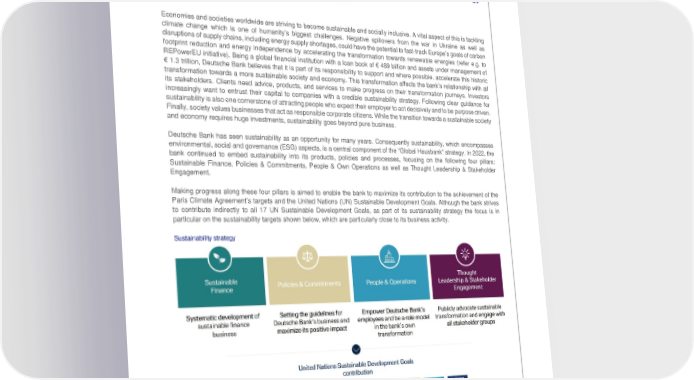 Deutsche Bank Transition toward a sustainable and climate-neutral economy Non-Financial Report 2022 Sustainability strategy and implementation Sustainability strategy and implementation – Sustainability embedded in corporate strategy – Adapted governance to ensure effective implementation of sustainability strategy – Establishment of Chief Sustainability Office Economies and societies worldwide are striving to become sustainable and socially inclusive. A vital aspect of this is tackling climate change which is one of humanity’s biggest challenges. Negative spillovers from the war in Ukraine as well as disruptions of supply chains, including energy supply shortages, could have the potential to fast-track Europe’s goals of carbon footprint reduction and energy independence by accelerating the transformation towards renewable energies (refer e.g. to REPowerEU initiative). Being a global financial institution with a loan book of € 489 billion and assets under management of € 1.3 trillion, Deutsche Bank believes that it is part of its responsibility to support and where possible, accelerate this historic transformation towards a more sustainable society and economy. This transformation affects the bank’s relationship with all its stakeholders. Clients need advice, products, and services to make progress on their transformation journeys. Investors increasingly want to entrust their capital to companies with a credible sustainability strategy. Following clear guidance for sustainability is also one cornerstone of attracting people who expect their employer to act decisively and to be purpose driven. Finally, society values businesses that act as responsible corporate citizens. While the transition towards a sustainable society and economy requires huge investments, sustainability goes beyond pure business. Deutsche Bank has seen sustainability as an opportunity for many years. Consequently sustainability, which encompasses environmental, social and governance (ESG) aspects, is a central component of the “Global Hausbank” strategy. In 2022, the bank continued to embed sustainability into its products, policies and processes, focusing on the following four pillars: Sustainable Finance, Policies & Commitments, People & Own Operations as well as Thought Leadership & Stakeholder Engagement. Making progress along these four pillars is aimed to enable the bank to maximize its contribution to the achievement of the Paris Climate Agreement’s targets and the United Nations (UN) Sustainable Development Goals. Although the bank strives to contribute indirectly to all 17 UN Sustainable Development Goals, as part of its sustainability strategy the focus is in particular on the sustainability targets shown below, which are particularly close to its business activity. Sustainability strategy To underpin its long-standing commitment to sustainability, Deutsche Bank formally endorsed universal sustainability frameworks and initiatives. The bank is a member of the UN’s Environment Programme Finance Initiative (1992) and signatory to the ten principles of the UN Global Compact (2000), the Principles for Responsible Investment (through DWS, 2008), the Principles for Responsible Banking (2019) and the Net-Zero Banking Alliance (2021). This chapter does not cover DWS which sets its own sustainability strategy. For details regarding DWS’ sustainability strategy please refer to the “Sustainable finance/Asset Management” chapter in this report. 13