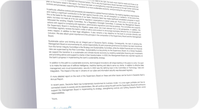 Dear Readers, With its 2019 transformation, Deutsche Bank adopted a clear strategy and substantially improved its financial results. This transformation, which the Supervisory Board has continuously supported, has been successfully executed. As a result of the realignment, the bank has regained credibility and confidence, as I learned from numerous discussions with clients, employees, investors, supervisors and politicians since I took office. To be successful in the long term it is not just the results that need to be right: the bank must meet its needs and those of all relevant stakeholders for important non-financial factors. This is why the Supervisory Board has been working intensively last year on the topics raised in this report. Our focus has been on strengthening corporate governance through further reinforced controls and processes, supporting the transition to a more sustainable economy, and promoting the use of technology. In particular, effective controls and processes are essential for a global financial institution. By meeting regulatory requirements and making a significant contribution to the fight against financial crime, we will strengthen our resilience. At the same time, this is the basis for the social acceptance of our bank. Deutsche Bank has made significant remediation progress in recent years, but does not meet all of its own and its regulators’ expectations in certain areas yet. That is why, in July last year, we refocused the existing Integrity Committee. As a Regulatory Oversight Committee, it oversees the Management Board’s actions with regard to complying with legislation, administrative regulations and internal policies. The committee also supports the Supervisory Board in monitoring the litigation cases which are most relevant from a risk perspective. In addition, the Committee regularly reviews the bank’s codes of ethics and conduct to encourage exemplary behavior by our employees in every respect, in addition to their legal obligations. It also remains a key objective for the bank to promote diversity and inclusion. We also attach great importance to this principle in the composition of the Supervisory Board and the Management Board. Sustainable action and thinking are an integral part of Deutsche Bank’s strategy. Consequently, the task of advising the Management Board on environmental (E), social responsibility (S) and corporate governance (G) matters has been transferred from the former Integrity Committee to the Strategy and Sustainability Committee, while the related financial and non-financial risks are supervised by the Risk Committee. Sustainability is a top priority for the Supervisory Board. As a Global Hausbank, we support the transition to a sustainable and climate-neutral economy by enabling sustainable financing and investments and providing advice and support to clients in their transformation. In 2022, the Management Board also reported regularly on the bank’s progress in implementing the bank’s sustainability strategy. In addition to the path to a sustainable economy, technological innovations will shape banking in the years to come. Our goal is to make the best use of artificial intelligence, machine learning and data to serve our clients. In addition to effective data management and cloud transformation, security in 2022 was the defining topic in the Committee on Technology, Data and Integration. The impact of the war in Ukraine on our cyber and information security was discussed regularly. A more detailed report on the work of the Supervisory Board on these and other issues can be found in Deutsche Bank’s Annual Report. In recent years, Deutsche Bank has fundamentally transformed its business model. It is once again profitable and has re- connected closely to society and its stakeholders. We will continue along this path and the Supervisory Board will continue to support the Management Board in implementing its strategy, strengthening controls and fulfilling Deutsche Bank’s social responsibilities. Yours, Alexander Wynaendts Chairman of the Supervisory Board Deutsche Bank AG 5