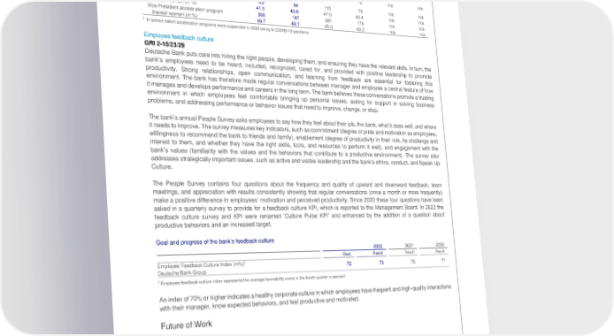 Deutsche Bank Employees and corporate social responsibility Non-Financial Report 2022 Employment and employability Acceleration programs 2022 2021 2020¹ Thereof: Thereof: Thereof: Deutsche Bank Deutsche Bank Deutsche Bank Deutsche Bank Deutsche Bank Deutsche Bank Group AG Group AG Group AG Participation in cross divisional talent acceleration programs (headcount) ATLAS acceleration program for senior 18 13 19 13 n/a n/a female Managing Directors Director acceleration program 123 94 115 76 n/a n/a thereof women (in %) 41.5 43.6 47.0 43.4 n/a n/a Vice President acceleration program 300 197 291 176 n/a n/a thereof women (in %) 49.7 49.7 45.0 43.2 n/a n/a 1 In-person talent acceleration programs were suspended in 2020 owing to COVID-19 pandemic Employee feedback culture GRI 2-18/23/29 Deutsche Bank puts care into hiring the right people, developing them, and ensuring they have the relevant skills. In turn, the bank’s employees need to be heard, included, recognized, cared for, and provided with positive leadership to promote productivity. Strong relationships, open communication, and learning from feedback are essential for fostering this environment. The bank has therefore made regular conversations between manager and employee a central feature of how it manages and develops performance and careers in the long term. The bank believes these conversations promote a trusting environment in which employees feel comfortable bringing up personal issues, asking for support in solving business problems, and addressing performance or behavior issues that need to improve, change, or stop. The bank’s annual People Survey asks employees to say how they feel about their job, the bank, what it does well, and where it needs to improve. The survey measures key indicators, such as commitment (degree of pride and motivation as employees, willingness to recommend the bank to friends and family), enablement (degree of productivity in their role, its challenge and interest to them, and whether they have the right skills, tools, and resources to perform it well), and engagement with the bank’s values (familiarity with the values and the behaviors that contribute to a productive environment). The survey also addresses strategically important issues, such as active and visible leadership and the bank’s ethics, conduct, and Speak-Up Culture. The People Survey contains four questions about the frequency and quality of upward and downward feedback, team meetings, and appreciation with results consistently showing that regular conversations (once a month or more frequently) make a positive difference in employees’ motivation and perceived productivity. Since 2020 these four questions have been asked in a quarterly survey to provide for a feedback culture KPI, which is reported to the Management Board. In 2022 the feedback culture survey and KPI were renamed ‘Culture Pulse KPI’ and enhanced by the addition of a question about productive behaviors and an increased target. Goal and progress of the bank’s feedback culture 2022 2021 2020 Goal Result Result Result 1 Employee Feedback Culture Index (in%) 72 73 70 71 Deutsche Bank Group 1 Employee feedback culture index represents the average favorability score in the fourth quarter in percent An index of 70% or higher indicates a healthy corporate culture in which employees have frequent and high-quality interactions with their manager, know expected behaviors, and feel productive and motivated. Future of Work GRI 2-25, 3-3, 401-2, 403-1/5/6, 404-2 Hybrid work model Deutsche Bank is a leading global organization because of its employees. Many of the bank’s employees had not experienced remote work until the COVID-19 pandemic. The bank’s regular Future of Work survey asked whether they would like to retain it to some degree. The majority of the bank’s employees prefer to work remotely one day per week or more. The bank believes hybrid work enables employees to combine the benefits of both remote and in-office work. The latter, however, remains critical for the face-to-face collaboration that fosters team spirit and creativity and that enables the bank to live up to its responsibilities toward its clients. Voluntary arrangements enable eligible employees to work remotely one to three days a week. The agreed-on schedule requires flexibility from both sides: employees may occasionally need to stay home on an in-office day or work in the office on a remote workday. 115