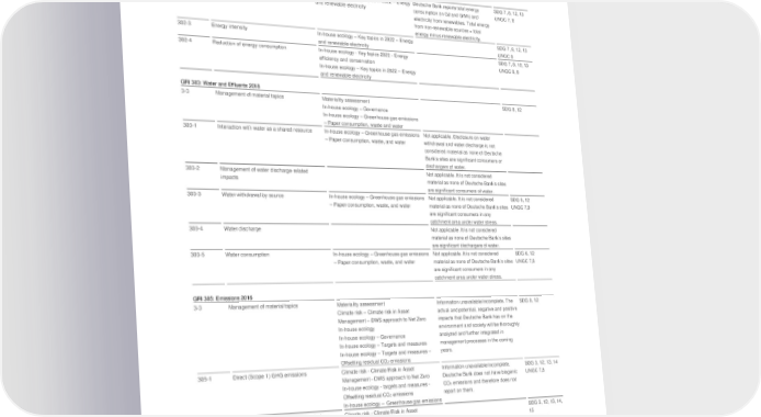 Deutsche Bank Appendix Non-Financial Report 2022 GRI Content Index and UN Global Compact SDG and GRI Standards and Disclosures Non-Financial Report and/or Link to Source Remarks/Omissions UNGC Reference In-house ecology In-house ecology – Governance In-house ecology – Key topics in 2022 – Energy efficiency and conservation In-house ecology – Greenhouse gas emissions – Paper consumption, waste and water 302-1 Energy consumption within the organization In-house ecology – Key topics in 2022 – Energy Deutsche Bank reports total energy SDG 7, 8, 12, 13 and renewable electricity consumption (in GJ and GWh) and UNGC 7, 8 electricity from renewables. Total energy from non-renewable sources = total energy minus renewable electricity. 302-3 Energy intensity In-house ecology – Key topics in 2022 – Energy SDG 7, 8, 12, 13 and renewable electricity UNGC 8 302-4 Reduction of energy consumption In-house ecology - Key topics 2022 - Energy SDG 7, 8, 12, 13 efficiency and conservation UNGC 8, 9 In-house ecology – Key topics in 2022 – Energy and renewable electricity GRI 303: Water and Effluents 2018 3-3 Management of material topics Materiality assessment SDG 8, 12 In-house ecology – Governance In-house ecology – Greenhouse gas emissions – Paper consumption, waste and water 303-1 Interaction with water as a shared resource In-house ecology – Greenhouse gas emissions Not applicable. Disclosure on water – Paper consumption, waste, and water withdrawal and water discharge is not considered material as none of Deutsche Bank’s sites are significant consumers or dischargers of water. 303-2 Management of water discharge-related Not applicable. It is not considered impacts material as none of Deutsche Bank’s sites are significant consumers of water. 303-3 Water withdrawal by source In-house ecology – Greenhouse gas emissions Not applicable. It is not considered SDG 6, 12 – Paper consumption, waste, and water material as none of Deutsche Bank’s sites UNGC 7,8 are significant consumers in any catchment area under water stress. 303-4 Water discharge Not applicable. It is not considered material as none of Deutsche Bank’s sites are significant dischargers of water. 303-5 Water consumption In-house ecology – Greenhouse gas emissions Not applicable. It is not considered SDG 6, 12 – Paper consumption, waste, and water material as none of Deutsche Bank’s sites UNGC 7,8 are significant consumers in any catchment area under water stress. GRI 305: Emissions 2016 3-3 Management of material topics Materiality assessment Information unavailable/incomplete. The SDG 8, 12 Climate risk – Climate risk in Asset actual and potential, negative and positive Management – DWS approach to Net Zero impacts that Deutsche Bank has on the In-house ecology environment and society will be thoroughly In-house ecology – Governance analyzed and further integrated in In-house ecology – Targets and measures management processes in the coming In-house ecology – Targets and measures – years. Offsetting residual CO emissions 2 305-1 Direct (Scope 1) GHG emissions Climate risk - Climate Risk in Asset Information unavailable/incomplete. SDG 3, 12, 13, 14 Management - DWS approach to Net Zero Deutsche Bank does not have biogenic UNGC 7,8 In-house ecology - targets and measures - CO emissions and therefore does not 2 Offsetting residual CO emissions report on them. 2 In-house ecology – Greenhouse gas emissions 305-2 Energy indirect (Scope 2) GHG emissions Climate risk - Climate Risk in Asset SDG 3, 12, 13, 14, Management - DWS approach to Net Zero 15 In-house ecology – Targets and measures – UNGC 7,8 Offsetting residual CO emissions 2 In-house ecology – Greenhouse gas emissions 305-3 Other indirect (Scope 3) GHG emissions In-house ecology – Targets and measures – Information unavailable/incomplete. SDG 3, 12, 13, 14, Offsetting residual CO emissions Deutsche Bank does not have biogenic 15 2 In-house ecology – Greenhouse gas emissions CO2 emissions and therefore does not UNGC 7,8 report on them. 305-4 GHG emissions intensity Climate risk - Climate Risk in Asset SDG 13, 14, 15 Management - DWS approach to Net Zero UNGC 8 In-house ecology – Targets and measures – Offsetting residual CO emissions 2 305-5 Reduction of GHG emissions In-house ecology – Targets and measures – SDG 13, 14, 15 Offsetting residual CO emissions UNGC 8,9 2 In-house ecology – Greenhouse gas emissions 140