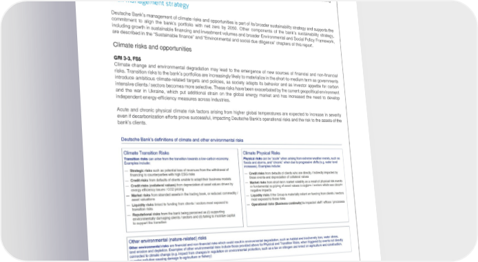 Deutsche Bank Transition toward a sustainable and climate-neutral economy Non-Financial Report 2022 Climate risk ESG related developments are covered by Group Audit as part of ongoing discussions with representatives of 1st and 2nd Line of Defense, (Chief Sustainability Office and Enterprise Risk Management teams respectively). In 2022, Group Audit conducted, a number of audits covering ESG-related risks, including an audit on ESG Governance, an audit on Risk and Control Assessment including Greenwashing, a targeted review on the Climate Risk Stress Testing of the European Central Bank and an audit on climate and environmental risks in Credit Risk Management of corporate and investment bank divisions. Furthermore, Group Audit developed guidance on auditing ESG, established a dedicated ESG team and a global working group, as well as defined a comprehensive audit coverage plan. Risk management strategy Deutsche Bank’s management of climate risks and opportunities is part of its broader sustainability strategy and supports the commitment to align the bank’s portfolio with net zero by 2050. Other components of the bank’s sustainability strategy, including growth in sustainable financing and investment volumes and broader Environmental and Social Policy Framework, are described in the “Sustainable finance” and “Environmental and social due diligence” chapters of this report. Climate risks and opportunities GRI 3-3, FS5 Climate change and environmental degradation may lead to the emergence of new sources of financial and non-financial risks. Transition risks to the bank’s portfolios are increasingly likely to materialize in the short-to-medium term as governments introduce ambitious climate-related targets and policies, as society adapts its behavior and as investor appetite for carbon intensive clients / sectors becomes more selective. These risks have been exacerbated by the current geopolitical environment and the war in Ukraine, which put additional strain on the global energy market and has increased the need to develop independent energy-efficiency measures across industries. Acute and chronic physical climate risk factors arising from higher global temperatures are expected to increase in severity even if decarbonization efforts prove successful, impacting Deutsche Bank’s operational risks and the risk to the assets of the bank’s clients. As explained in more detail in the sub-chapter Risk management framework – Risk identification and materiality assessment below, Deutsche Bank has conducted a structured materiality assessment to estimate potential impacts of these risk drivers across risk types and established policies, procedures and dedicated risk appetite to manage risks, including: – Interim (2030) and final (2050) net-zero aligned targets for key carbon intensive sectors to manage transition risks, which are fully embedded into internal governance structures and risk appetite frameworks – Environmental and Social policy frameworks and restrictions – Integration of ESG risk assessment into credit rating models and decision making – Specific requirements to assess and mitigate physical risks to immovable real estate collateral – Liquidity risk stress testing – Business Continuity and 3rd party risk management frameworks 40