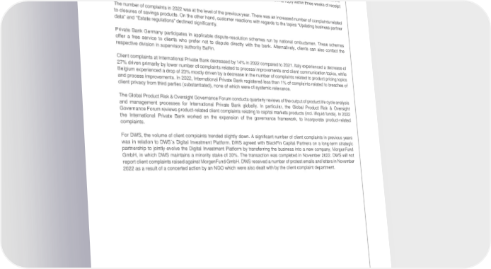 Deutsche Bank Governance and operations Non-Financial Report 2022 Client satisfaction Private Bank Germany conducts an integrated complaint management for its Deutsche Bank and Postbank brands focusing on client-oriented solutions and regular analytic reporting to both management and sales channels. This information is considered in other processes like Product Lifecycle Reviews to continuously improve the quality of customer experience, product portfolio, and advisory. Complaints are recorded in a digital register and forwarded to the responsible department which analyses and processes the facts carefully and answers the customer. As a general rule, the complainant receives a final reply within three weeks of receipt of the complaint. The number of complaints in 2022 was at the level of the previous year. There was an increased number of complaints related to closures of savings products. On the other hand, customer reactions with regards to the topics “Updating business partner data” and “Estate regulations” declined significantly. Private Bank Germany participates in applicable dispute-resolution schemes run by national ombudsmen. These schemes offer a free service to clients who prefer not to dispute directly with the bank. Alternatively, clients can also contact the respective division in supervisory authority BaFin. Client complaints at International Private Bank decreased by 14% in 2022 compared to 2021. Italy experienced a decrease of 27% driven primarily by lower number of complaints related to process improvements and client communication topics, while Belgium experienced a drop of 23% mostly driven by a decrease in the number of complaints related to product pricing topics and process improvements. In 2022, International Private Bank registered less than 1% of complaints related to breaches of client privacy from third parties (substantiated), none of which were of systemic relevance. The Global Product Risk & Oversight Governance Forum conducts quarterly reviews of the output of product life cycle analysis and management processes for International Private Bank globally. In particular, the Global Product Risk & Oversight Governance Forum reviews product-related client complaints relating to capital markets products (incl. illiquid funds). In 2022 the International Private Bank worked on the expansion of the governance framework, to incorporate product-related complaints. For DWS, the volume of client complaints trended slightly down. A significant number of client complaints in previous years was in relation to DWS´s Digital Investment Platform. DWS agreed with BlackFin Capital Partners on a long-term strategic partnership to jointly evolve the Digital Investment Platform by transferring the business into a new company, MorgenFund GmbH, in which DWS maintains a minority stake of 30%. The transaction was completed in November 2022. DWS will not report client complaints raised against MorgenFund GmbH. DWS received a number of protest emails and letters in November 2022 as a result of a concerted action by an NGO which were also dealt with by the client complaint department. 99