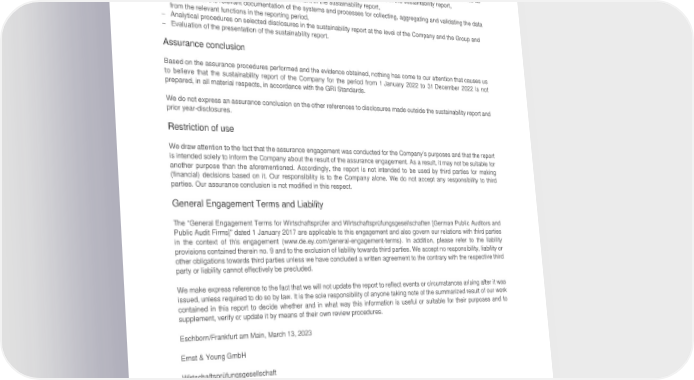 Deutsche Bank Appendix Non-Financial Report 2022 Reports of the independent auditor – Inquiries of the executive directors and relevant employees involved in the preparation of the non-financial report about the preparation process, about the internal control system related to this process, and about disclosures in the non-financial report, – Inquiries of the employees regarding the selection of topics for the sustainability report, the risk assessment and the policies of the Company and the Group for the topics identified as material, – Inquiries of employees responsible for data capture and consolidation about the data capture and compilation methods as well as internal controls to the extent relevant for the assurance of the disclosures in the sustainability report, – Identification of likely risks of material misstatement in the sustainability report, – Inspection of the relevant documentation of the systems and processes for collecting, aggregating and validating the data from the relevant functions in the reporting period, – Analytical procedures on selected disclosures in the sustainability report at the level of the Company and the Group and – Evaluation of the presentation of the sustainability report. Assurance conclusion Based on the assurance procedures performed and the evidence obtained, nothing has come to our attention that causes us to believe that the sustainability report of the Company for the period from 1 January 2022 to 31 December 2022 is not prepared, in all material respects, in accordance with the GRI Standards. We do not express an assurance conclusion on the other references to disclosures made outside the sustainability report and prior year-disclosures. Restriction of use We draw attention to the fact that the assurance engagement was conducted for the Company’s purposes and that the report is intended solely to inform the Company about the result of the assurance engagement. As a result, it may not be suitable for another purpose than the aforementioned. Accordingly, the report is not intended to be used by third parties for making (financial) decisions based on it. Our responsibility is to the Company alone. We do not accept any responsibility to third parties. Our assurance conclusion is not modified in this respect. General Engagement Terms and Liability The “General Engagement Terms for Wirtschaftsprüfer and Wirtschaftsprüfungsgesellschaften [German Public Auditors and Public Audit Firms]” dated 1 January 2017 are applicable to this engagement and also govern our relations with third parties in the context of this engagement (www.de.ey.com/general-engagement-terms). In addition, please refer to the liability provisions contained therein no. 9 and to the exclusion of liability towards third parties. We accept no responsibility, liability or other obligations towards third parties unless we have concluded a written agreement to the contrary with the respective third party or liability cannot effectively be precluded. We make express reference to the fact that we will not update the report to reflect events or circumstances arising after it was issued, unless required to do so by law. It is the sole responsibility of anyone taking note of the summarized result of our work contained in this report to decide whether and in what way this information is useful or suitable for their purposes and to supplement, verify or update it by means of their own review procedures. Eschborn/Frankfurt am Main, March 13, 2023 Ernst & Young GmbH Wirtschaftsprüfungsgesellschaft Holger Lösken Yvonne Meyer Wirtschaftsprüfer Wirtschaftsprüferin (German Public Auditor) (German Public Auditor) 130