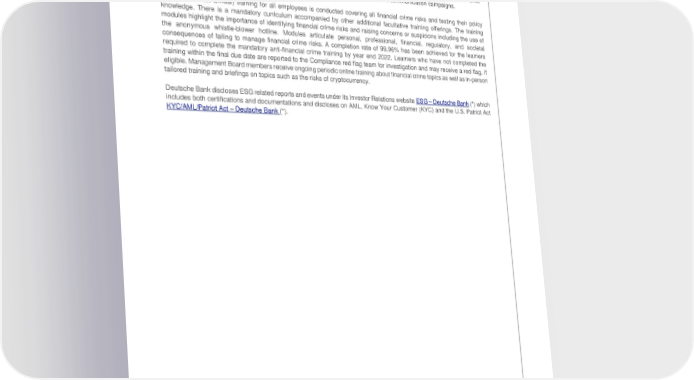 Deutsche Bank Governance and operations Non-Financial Report 2022 Anti-financial crime Deutsche Bank’s most critical asset against financial crime risks are its employees. Deutsche Bank promotes a risk culture that encourages employees to speak-up and a thorough awareness for financial crime risks. Deutsche Bank has carefully nurtured a culture of compliance and integrity in the bank, including the fight against financial crime. Tone from the top is extremely important and senior management is highly committed to drive cultural change through behavioral changes and reinforcing the change. Culture initiatives are driven both on group and divisional level across Deutsche Bank and a culture review framework is in place to identify areas that may be exhibiting poor culture to act through targeted culture reviews. Special focus is put on speak-up, which is subject of wide-ranging training efforts and communication campaigns. Regular (at least annual) training for all employees is conducted covering all financial crime risks and testing their policy knowledge. There is a mandatory curriculum accompanied by other additional facultative training offerings. The training modules highlight the importance of identifying financial crime risks and raising concerns or suspicions including the use of the anonymous whistle-blower hotline. Modules articulate personal, professional, financial, regulatory, and societal consequences of failing to manage financial crime risks. A completion rate of 99,96% has been achieved for the learners required to complete the mandatory anti-financial crime training by year end 2022. Learners who have not completed the training within the final due date are reported to the Compliance red flag team for investigation and may receive a red flag, if eligible. Management Board members receive ongoing periodic online training about financial crime topics as well as in-person tailored training and briefings on topics such as the risks of cryptocurrency. (*) which Deutsche Bank discloses ESG related reports and events under its Investor Relations website ESG – Deutsche Bank includes both certifications and documentations and discloses on AML, Know Your Customer (KYC) and the U.S. Patriot Act KYC/AML/Patriot Act – Deutsche Bank (*). 88