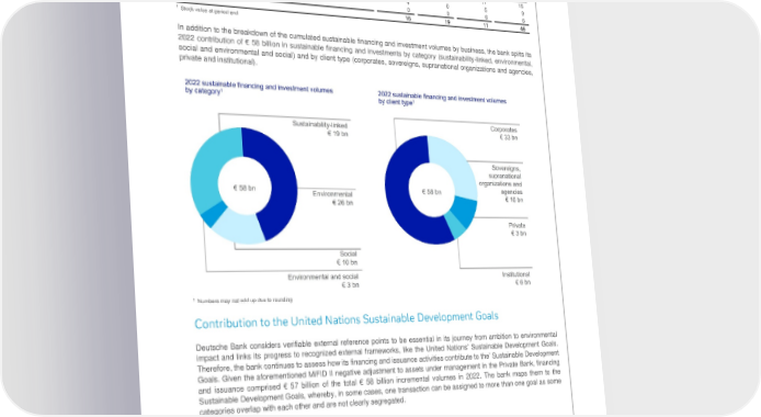 Deutsche Bank Transition toward a sustainable and climate-neutral economy Non-Financial Report 2022 Sustainable finance Dec 31, 2020 Assets under 1 in € bn. Financing Issuance Management Total Corporate Bank 6 0 0 6 Investment Bank 6 19 0 25 Fixed Income and Currencies 6 2 0 8 Origination and Advisory 0 17 0 17 Private Bank 4 0 11 15 Private Bank Germany 4 0 5 9 International Private Bank 0 0 6 6 Total 16 19 11 46 1 Stock value at period end In addition to the breakdown of the cumulated sustainable financing and investment volumes by business, the bank splits its 2022 contribution of € 58 billion in sustainable financing and investments by category (sustainability-linked, environmental, social and environmental and social) and by client type (corporates, sovereigns, supranational organizations and agencies, private and institutional). 1 Numbers may not add up due to rounding Contribution to the United Nations Sustainable Development Goals Deutsche Bank considers verifiable external reference points to be essential in its journey from ambition to environmental impact and links its progress to recognized external frameworks, like the United Nations’ Sustainable Development Goals. Therefore, the bank continues to assess how its financing and issuance activities contribute to the’ Sustainable Development Goals. Given the aforementioned MiFID II negative adjustment to assets under management in the Private Bank, financing and issuance comprised € 57 billion of the total € 58 billion incremental volumes in 2022. The bank maps them to the Sustainable Development Goals, whereby, in some cases, one transaction can be assigned to more than one goal as some categories overlap with each other and are not clearly segregated. 22