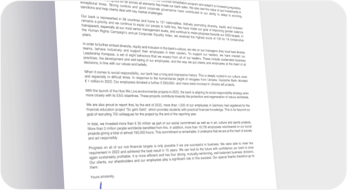 However, this alone is not enough. To entrench a strong risk culture, Deutsche Bank encourages everyone to speak out when something doesn't seem right. This “Speak-Up Culture” is what we expect. Another important aspect of a strong risk culture is that our bank can meet the requirement to record business-related communications. As such, our employees are only permitted to use approved communication channels, and Deutsche Bank has further strengthened its processes and controls here. Although we understand we have work to do to deliver our controls remediation program and adapt it to increasing regulatory requirements, the progress so far across all elements has made our bank safer. We also see the value of our investments in exceptional times. Strong controls and good corporate governance have contributed to our ability to adapt to evolving sanctions and help clients deal with key market challenges. Our bank is represented in 58 countries and home to 157 nationalities. Actively promoting diversity, equity and inclusion remains a priority and we continue to equip our people to fulfill this. We have made our goal of improving gender balance transparent, especially at our most senior management levels, and continue to make progress towards our 2025 targets. In the Human Rights Campaign's annual Corporate Equality Index, we received the highest score of 100 for 19 consecutive years. In order to further embed diversity, equity and inclusion in the bank’s culture, we rely on our managers; they must lead diverse teams, behave inclusively and support their employees in their careers. To support our leaders, we have created our Leadership Kompass, a set of eight behaviors that we expect from all of our leaders. These include sustainable business practices, the development and well-being of our employees, and the way we put clients and employees at the heart of all decisions, in line with our values and beliefs. When it comes to social responsibility, our bank has a long and impressive history. This is deeply rooted in our culture, even and especially in difficult times. In response to the humanitarian plight of refugees from Ukraine, Deutsche Bank donated € 1 million in 2022. Our employees donated a further € 500,000+ and many were involved in Ukraine aid projects. With the launch of the How We Live environmental projects in 2022, the bank is aligning its social responsibility strategy even more closely with its ESG objectives. These projects contribute towards the protection and regeneration of nature worldwide. We are also proud to report that, by the end of 2022, more than 1,000 of our employees in Germany had registered for the financial education project “So geht Geld”, which provides students with practical financial knowledge. This is far beyond our goal of recruiting 700 colleagues for the project by the end of the reporting year. In total, we invested more than € 55 million as part of our social commitment as well as in art, culture and sports projects. More than 3 million people worldwide benefited from this. In addition, more than 18,700 employees volunteered on our social projects giving a total of almost 190,000 hours. This commitment is remarkable. It underpins that we are at the heart of society and act responsibly. Progress on all of our non-financial targets is only possible if we are successful in business. We were able to meet this requirement in 2022 and achieved the best result in 15 years. We can look to the future with confidence; our bank is once again sustainably profitable. It is more efficient and has four strong, mutually-reinforcing, well-balanced business divisions. Our clients, our shareholders and our employees play a significant role in this success. Our special thanks therefore go to them. Yours sincerely, Christian Sewing 4