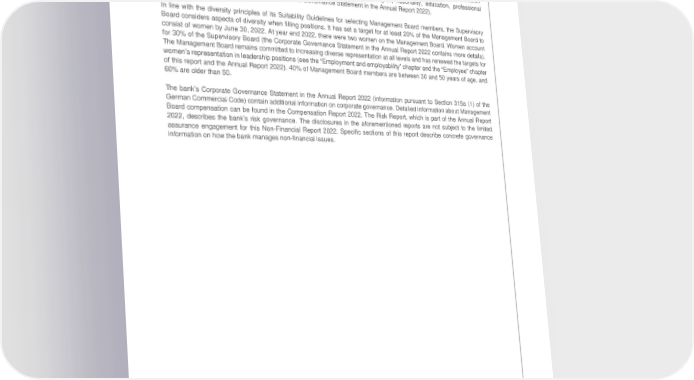 Deutsche Bank Governance and operations Non-Financial Report 2022 Corporate governance Using contract templates and standardized annexes, the variable compensation components are directly linked to the plan, claw back, and forfeiture conditions as well as the shareholding obligations. Diversity, equity and inclusion are essential for the bank’s success. They help Deutsche Bank forge enduring relationships with clients, business partners and employees, make balanced decisions, spur innovation, and play an active role in the countries and communities where the bank does business. The bank’s broad understanding of diversity, equality and inclusion encompasses age, gender, sexual and gender identity, ability, ethnicity, religion, nationality, education, professional background, and other aspects (see the Corporate Governance Statement in the Annual Report 2022). In line with the diversity principles of its Suitability Guidelines for selecting Management Board members, the Supervisory Board considers aspects of diversity when filling positions. It has set a target for at least 20% of the Management Board to consist of women by June 30, 2022. At year end 2022, there were two women on the Management Board. Women account for 30% of the Supervisory Board (the Corporate Governance Statement in the Annual Report 2022 contains more details). The Management Board remains committed to increasing diverse representation at all levels and has renewed the targets for women’s representation in leadership positions (see the “Employment and employability” chapter and the “Employee” chapter of this report and the Annual Report 2022). 40% of Management Board members are between 30 and 50 years of age, and 60% are older than 50. The bank’s Corporate Governance Statement in the Annual Report 2022 (information pursuant to Section 315a (1) of the German Commercial Code) contain additional information on corporate governance. Detailed information about Management Board compensation can be found in the Compensation Report 2022. The Risk Report, which is part of the Annual Report 2022, describes the bank’s risk governance. The disclosures in the aforementioned reports are not subject to the limited assurance engagement for this Non-Financial Report 2022. Specific sections of this report describe concrete governance information on how the bank manages non-financial issues. 74